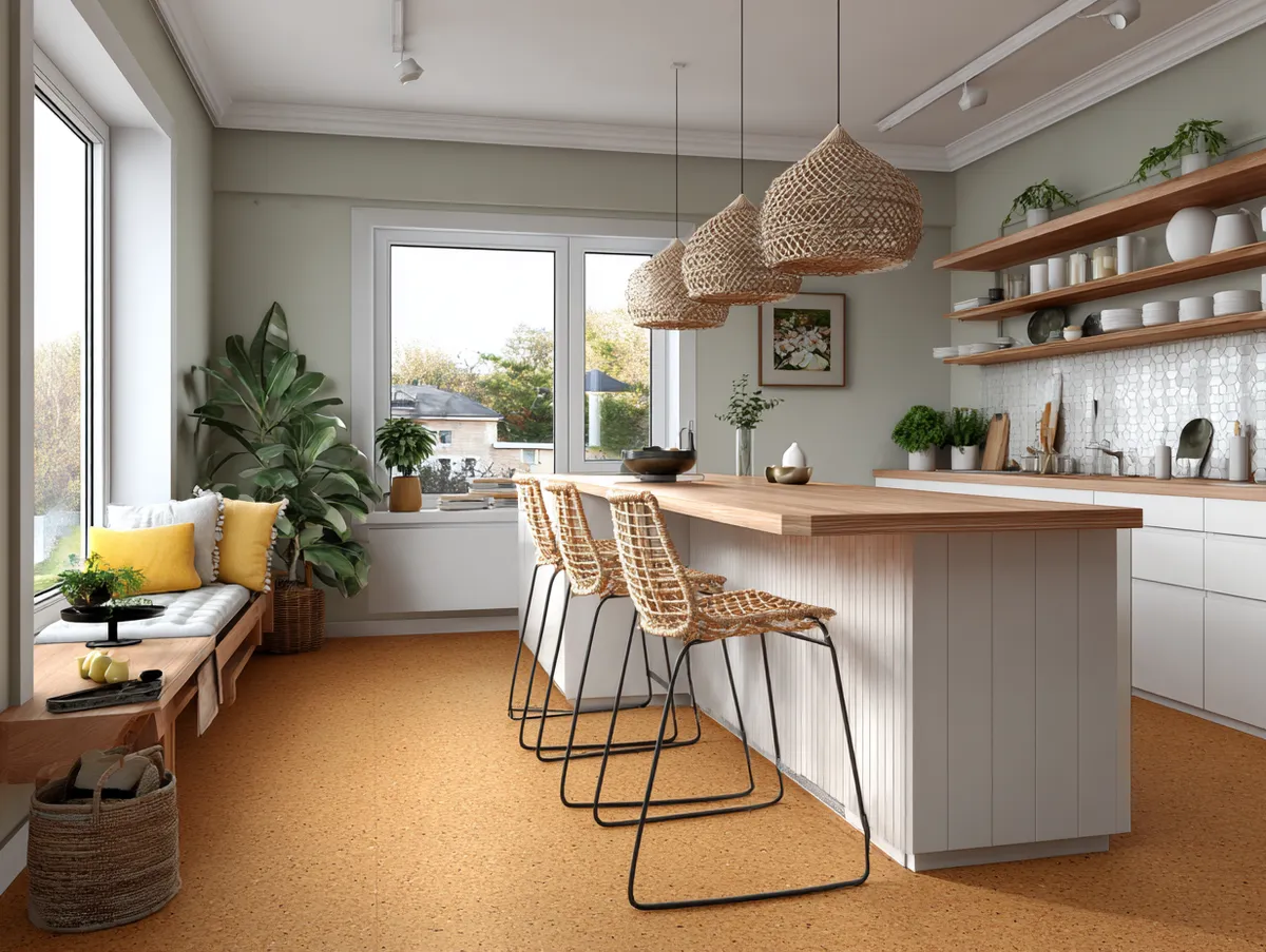 Cork flooring, as depicted in the image, is available in a variety of colors and patterns. It’s a versatile choice that can adapt to different kitchen styles, whether modern or traditional.