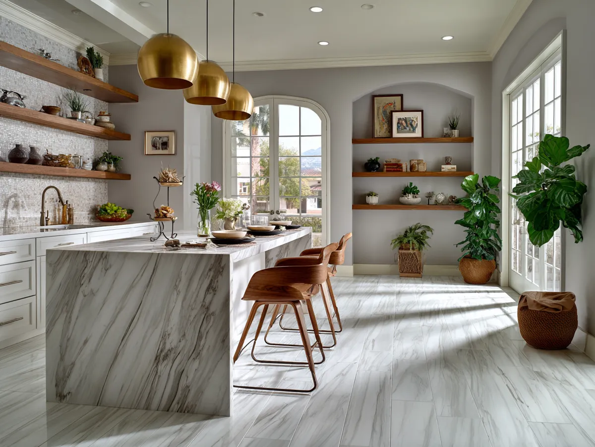 Aesthetically, porcelain tiles offer a wide variety of designs. From faux wood to marble effects, there’s a style to suit every kitchen design. In the image, the tiles emulate the warm, earthy look of natural stone, complementing the kitchen’s contemporary aesthetic.