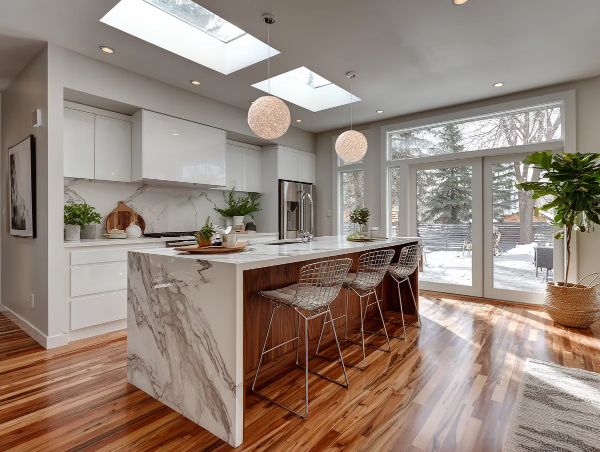 Additionally, hardwood flooring is versatile in terms of style. It’s available in a range of colors, grains, and finishes, making it adaptable to different kitchen designs. In the image, the floor’s rich, dark finish enhances the kitchen’s modern aesthetic.