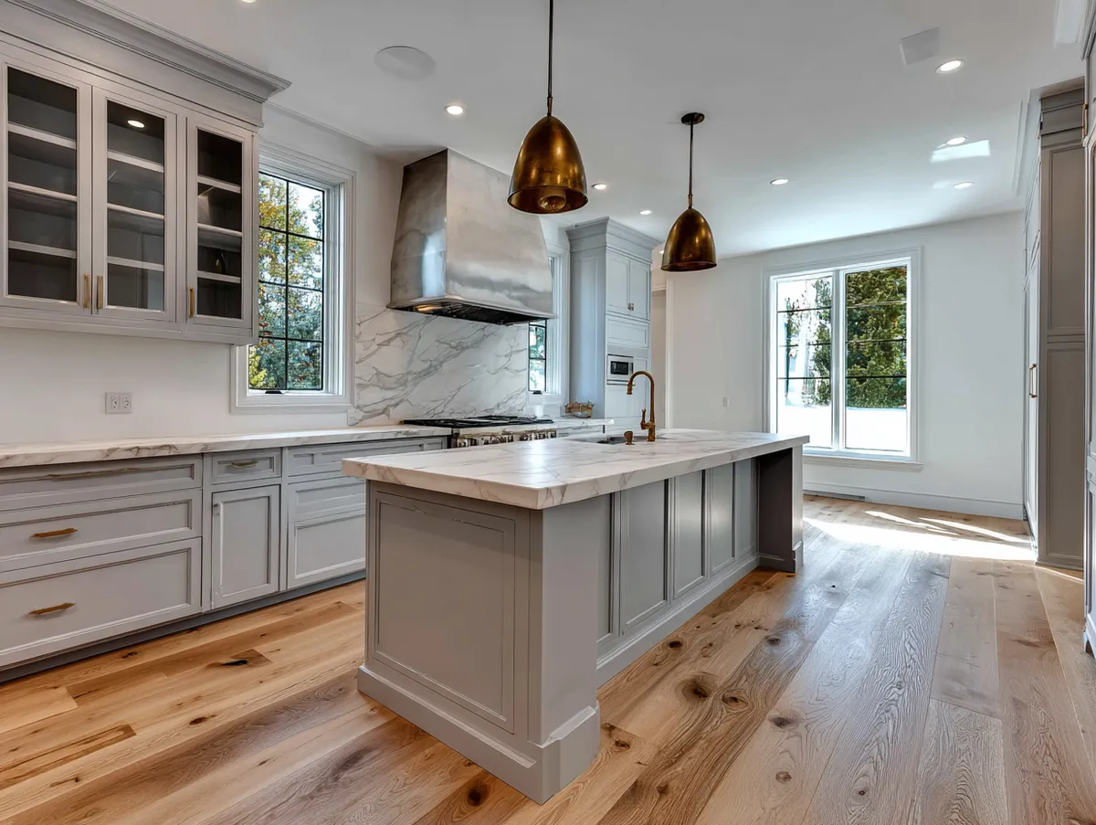 Hardwood floors add a timeless beauty to any kitchen. They bring warmth and a natural touch to the space, contributing to a welcoming atmosphere. The featured kitchen uses dark hardwood flooring, which contrasts beautifully with the white cabinetry, creating an eye-catching design.