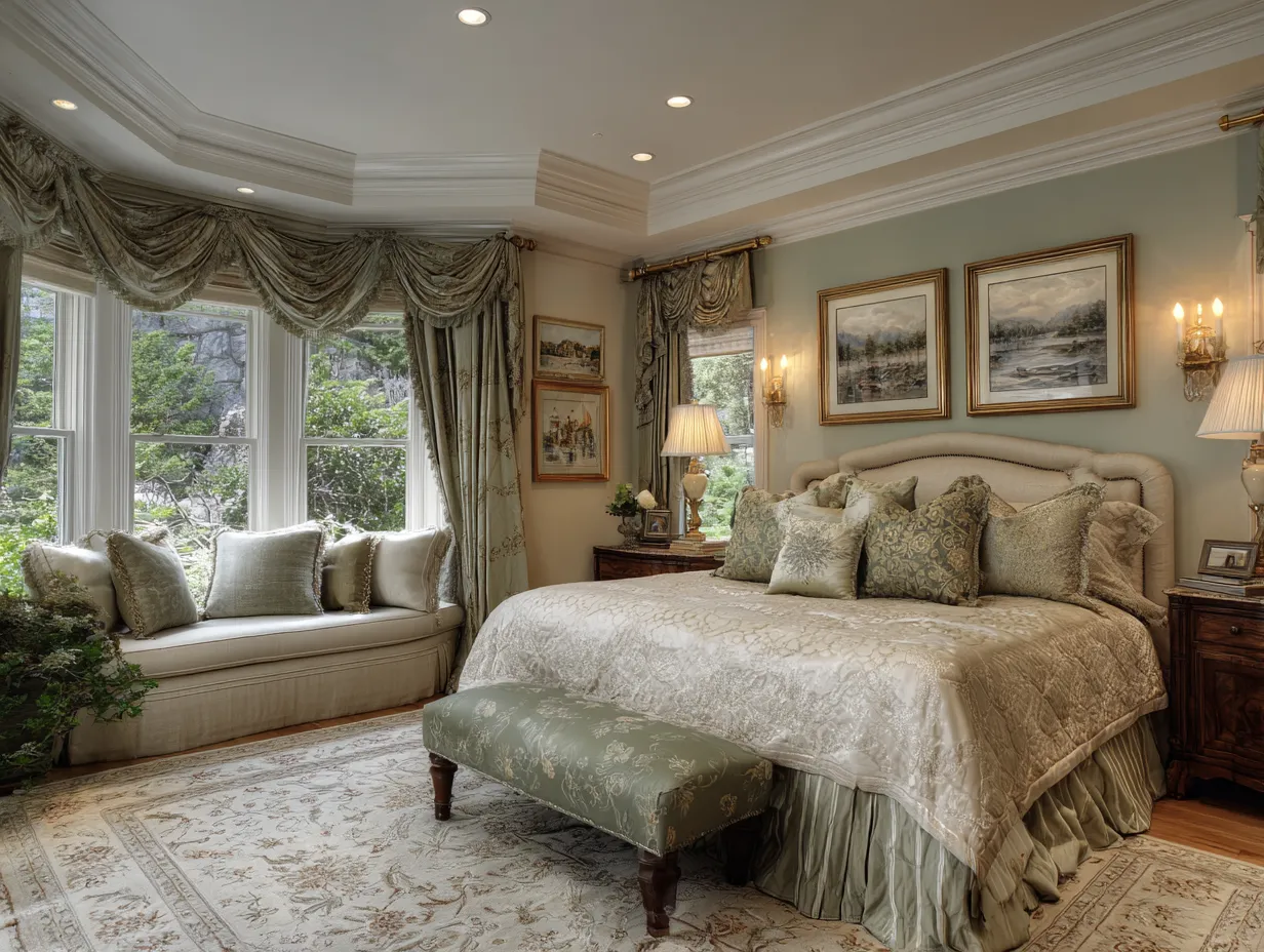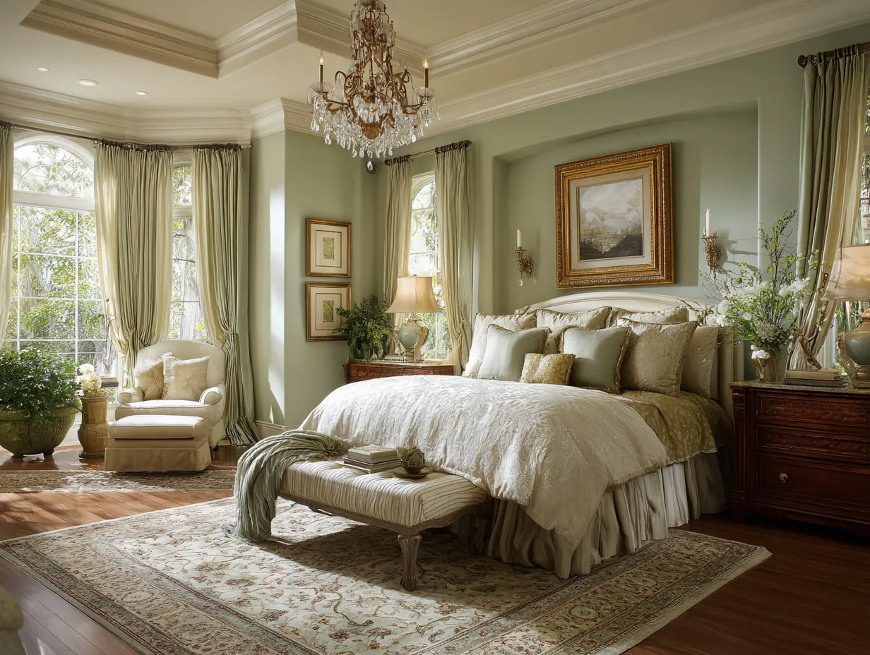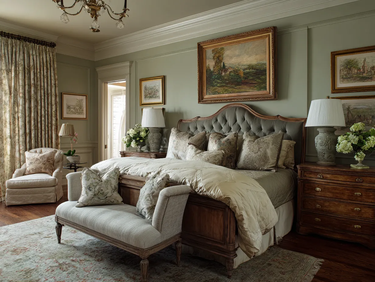 The blend of sage green and cream in this setting evokes nostalgia and luxury in equal measure. The interplay of color and antique form creates a sense of romantic storytelling—one that’s tactile, lived-in, and incredibly intimate. This master bedroom design doesn’t shout; it whispers with elegance and memory.