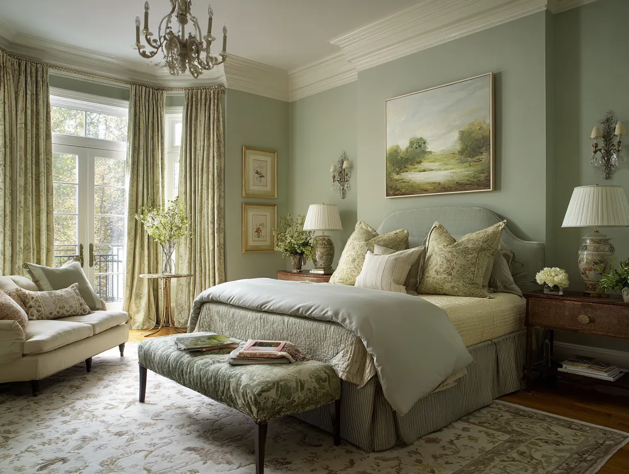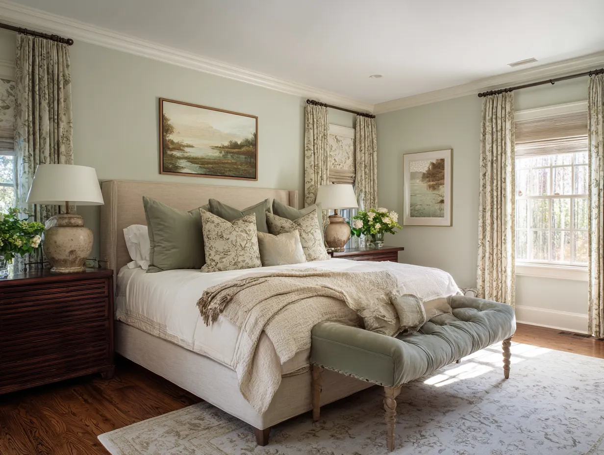 Master Bedroom Design with Layered Sage Green Textiles and Cream Stone Walls
