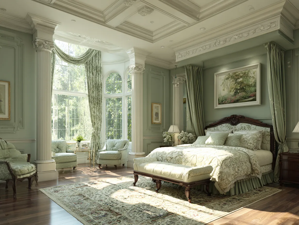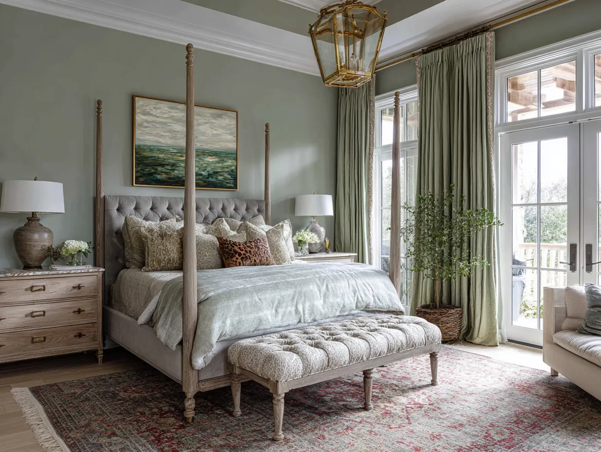 Master Bedroom Design Featuring Vintage Cream Canopy Bed and Sage Green Ceiling