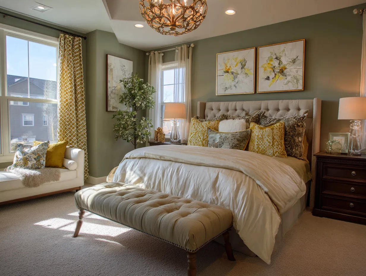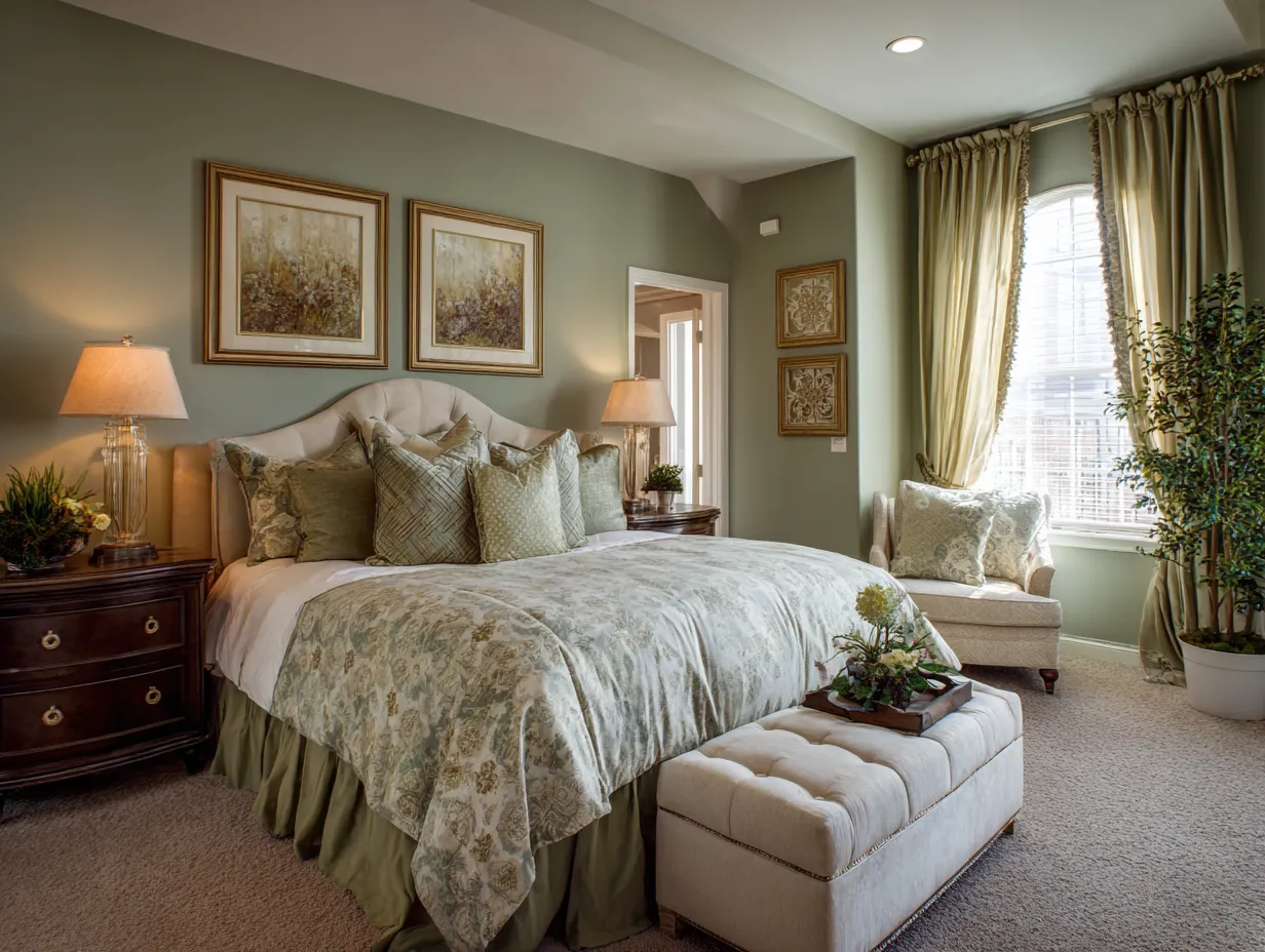 This interpretation of a master bedroom design uses sage green as the emotional heart of the space, while cream offers structure and light. The palette never competes—it collaborates. It invites stillness, softness, and a grounded form of beauty that feels as natural as it does refined.