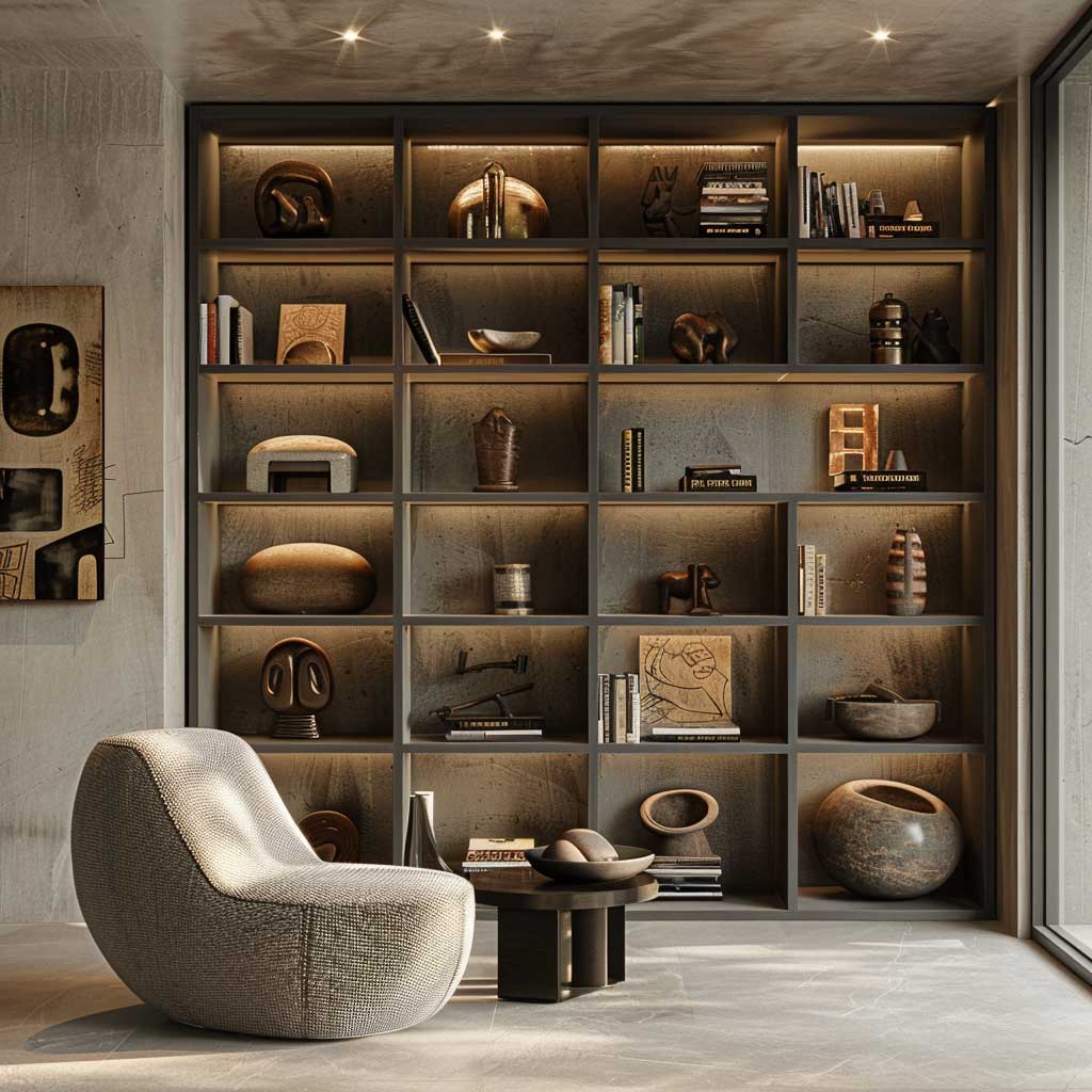When arranging items on the bookshelf, opt for a minimalist approach. Group items by color or theme to create a cohesive look. Incorporate a mix of textures, such as matte and glossy finishes, to add depth and interest. Soft lighting, such as a nearby floor lamp or spotlights, can highlight the bookshelf and its contents.