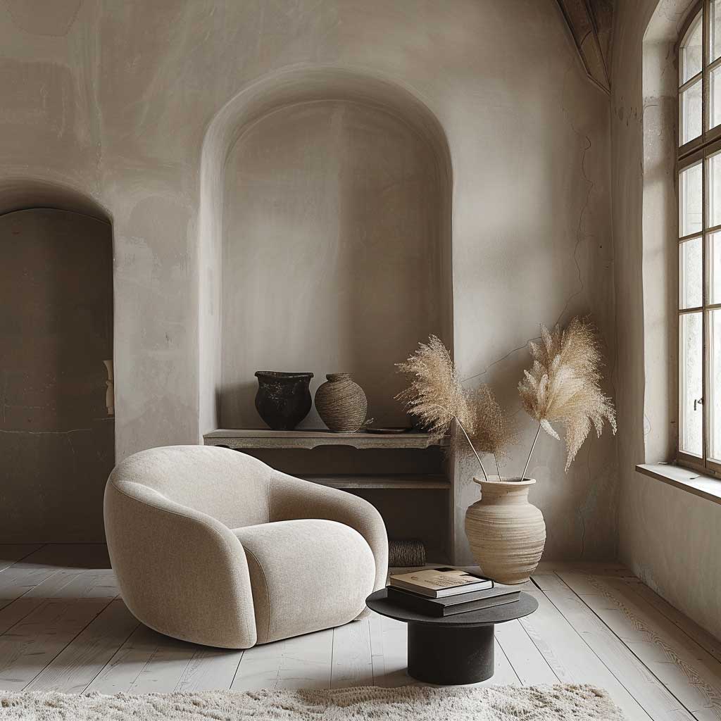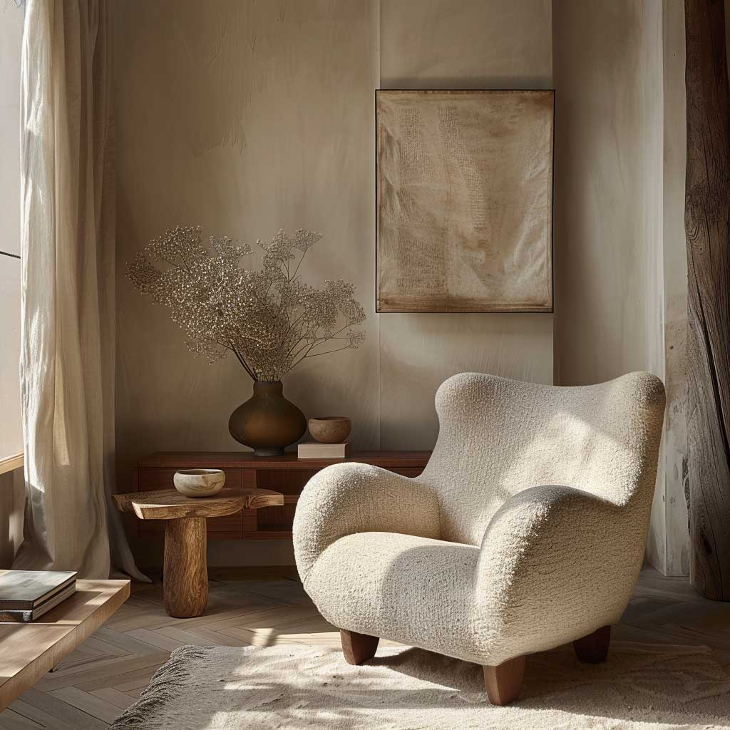 Decorative elements should be minimal and purposeful. Choose a few key pieces, such as a soft throw blanket or a stylish cushion, to add comfort and interest. The neutral tones of the armchair can be echoed in other decor elements, such as artwork or rugs, to create a harmonious look.