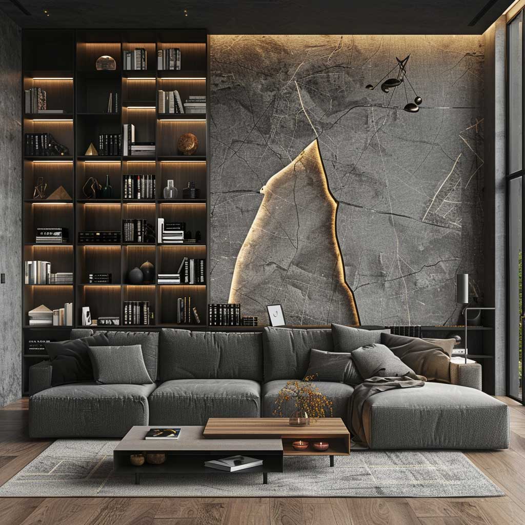 The black and white bookshelf with a geometric design brings a modern and sophisticated touch to your sitting room. It serves as both a functional storage solution and a stylish decor element, enhancing the overall aesthetic of the room. The combination of bold design and minimalist decor creates a space that feels contemporary and inviting.