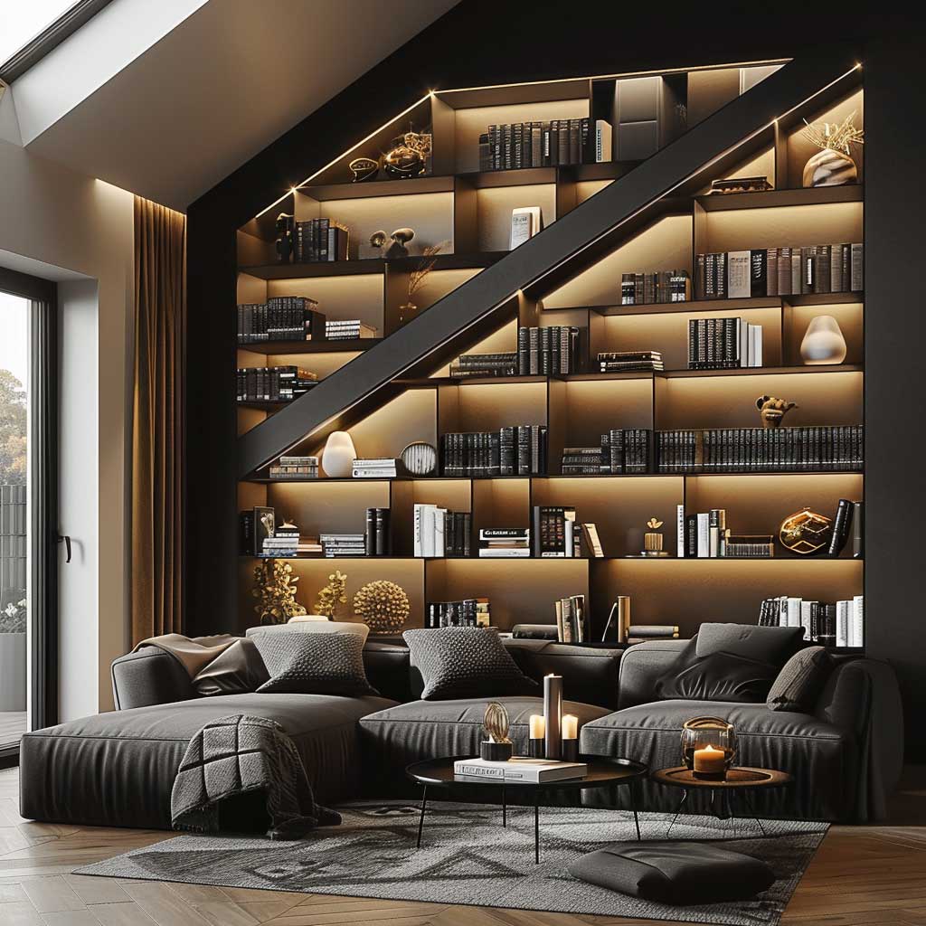 A black and white bookshelf with a geometric design can add a unique and stylish touch to your sitting room. The bold design and monochrome palette make it a standout piece that complements minimalist decor. The geometric elements add visual interest while maintaining a clean and modern aesthetic.