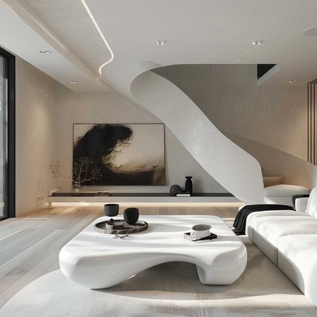 The minimalist white coffee table with black accents brings a touch of sophistication to your sitting room. It serves as a functional and stylish element, enhancing the overall design without overpowering the space. The result is a modern, monochrome room that feels both elegant and inviting.