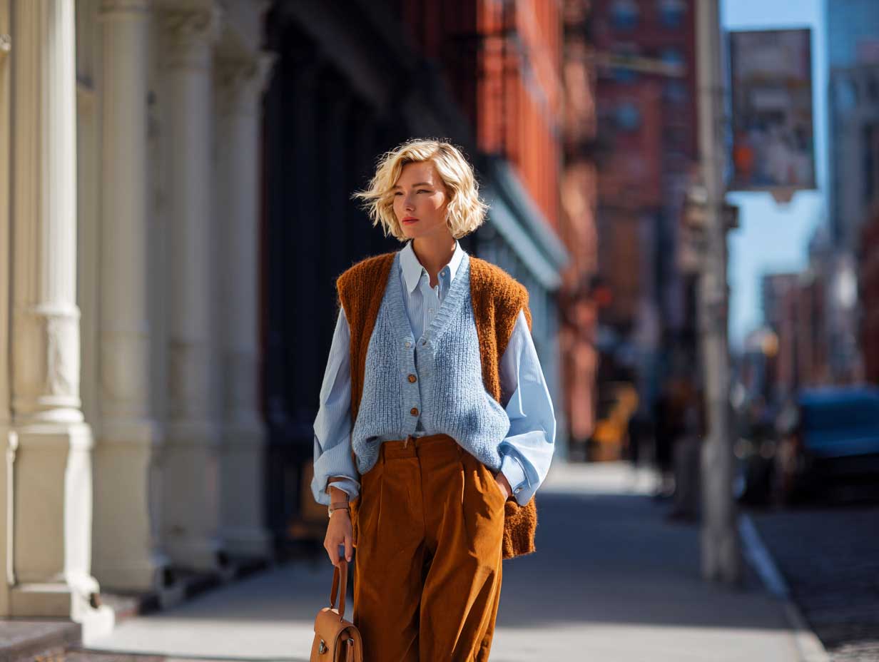 In a world where comfort and style are no longer mutually exclusive, ice blue jeans and cinnamon brown cropped knit vests make a perfect pair. The denim adds a casual and familiar base, while the warm-toned vest injects character, especially when cropped just enough to hint at playfulness without sacrificing polish.