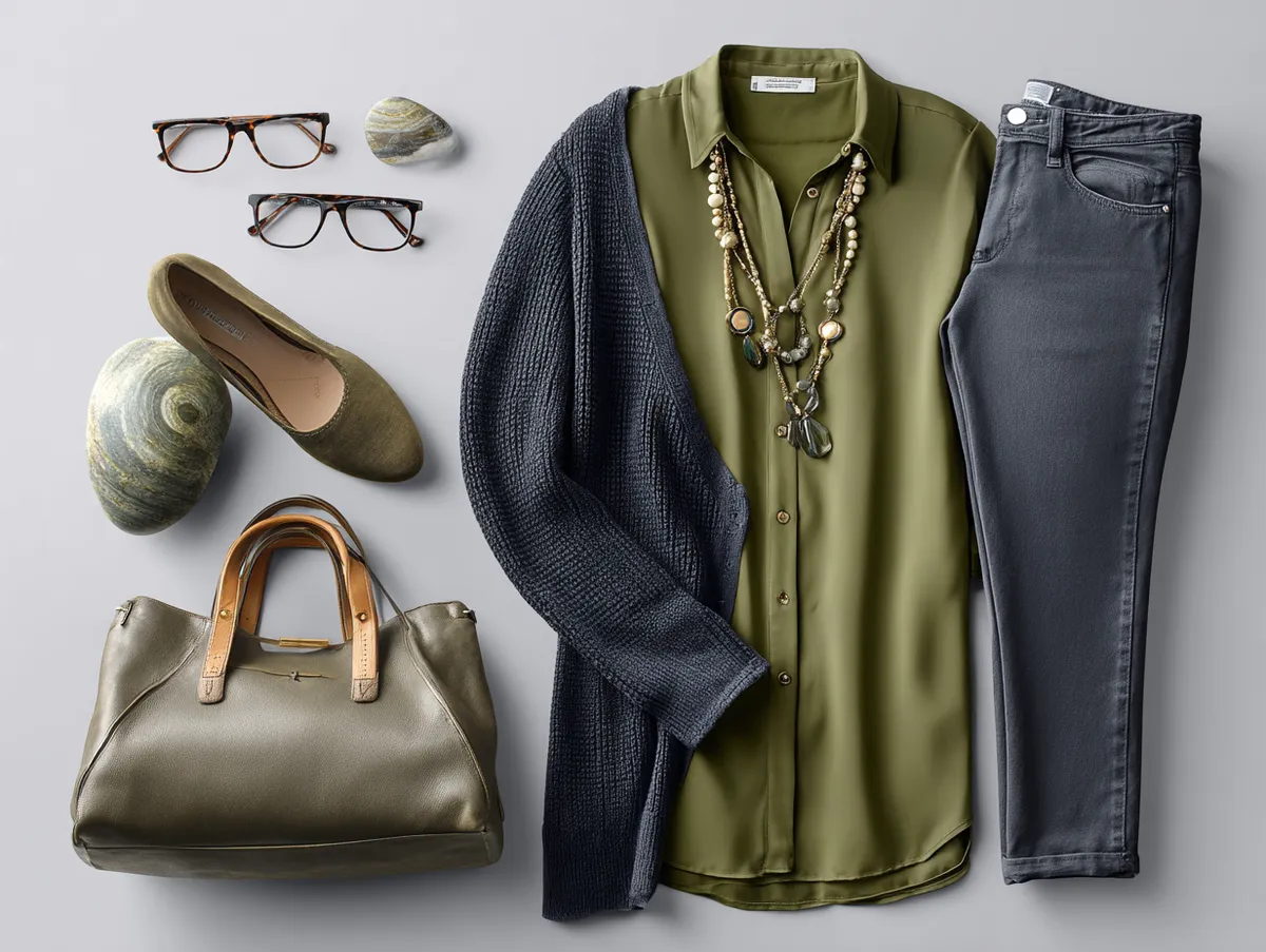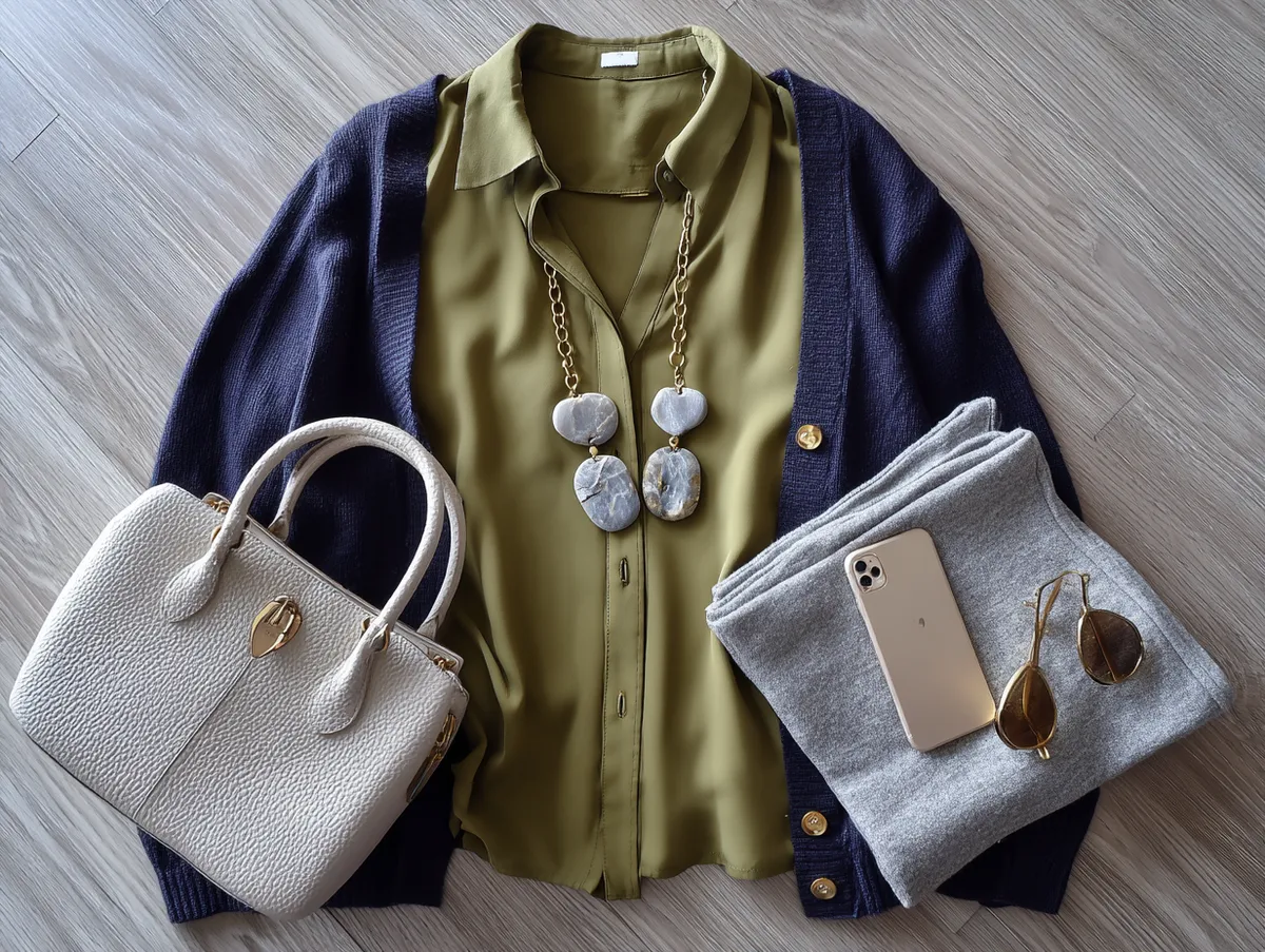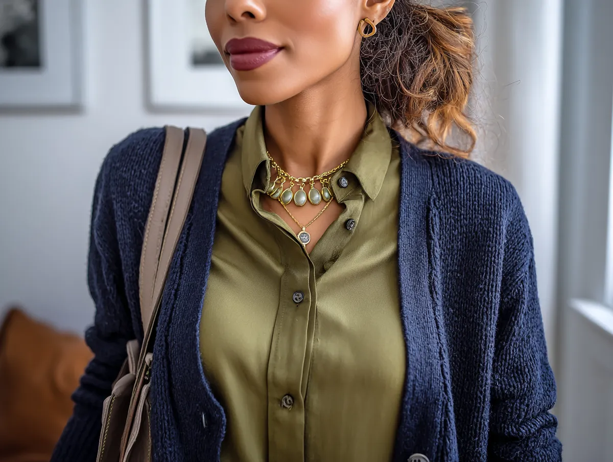 An olive green and navy combination offers a perfect balance of comfort and style for Taurus. The olive green blouse adds a touch of color that feels earthy and grounded, which aligns with the Taurus preference for natural tones. Layered under a navy cardigan, this outfit provides a comfortable and polished look that can easily adapt to various temperatures in the office. The combination of colors is practical, professional, and subtly stylish, making it one of the most fitting work outfit ideas for Taurus who value versatility.