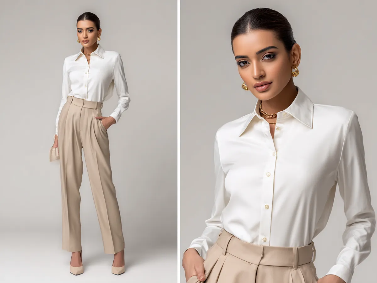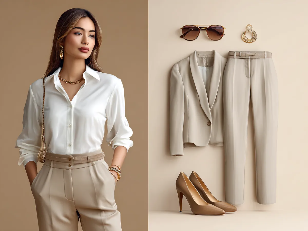 The practicality of this look extends to the fabric choices as well. High-quality materials that provide comfort and breathability make it easy for Taurus to stay focused throughout the day. The beige high-waisted trousers offer a tailored fit that’s flattering yet comfortable, making this outfit one of the most versatile work outfit ideas for those who value both form and function. The color palette reflects the earthy, grounded nature of Taurus, allowing them to feel connected to their personal style while still adhering to professional dress codes.