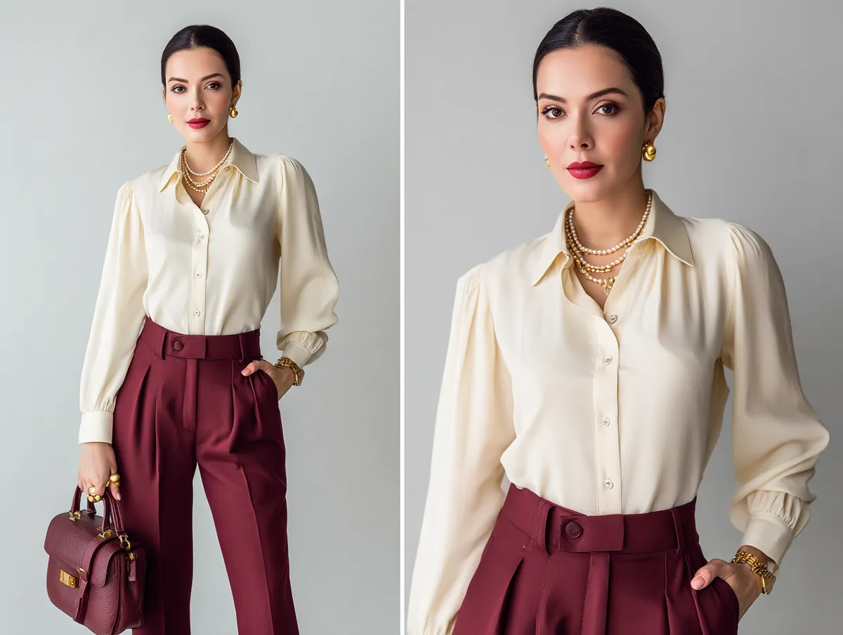Accessories play a key role in enhancing this outfit without detracting from its simplicity. A matching burgundy handbag adds a functional element that ties the look together, while a gold watch provides a classic touch. The choice of accessories complements the outfit’s colors, adding a layer of sophistication that feels intentional but not overdone. For footwear, pointed-toe flats or heels in a matching cream or burgundy tone can complete the look, ensuring that every detail is cohesive.