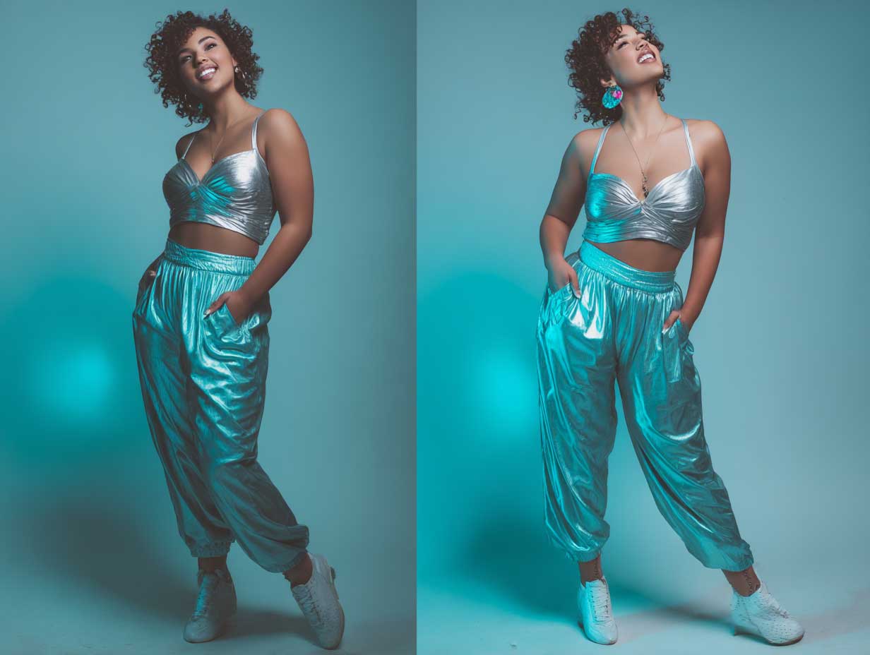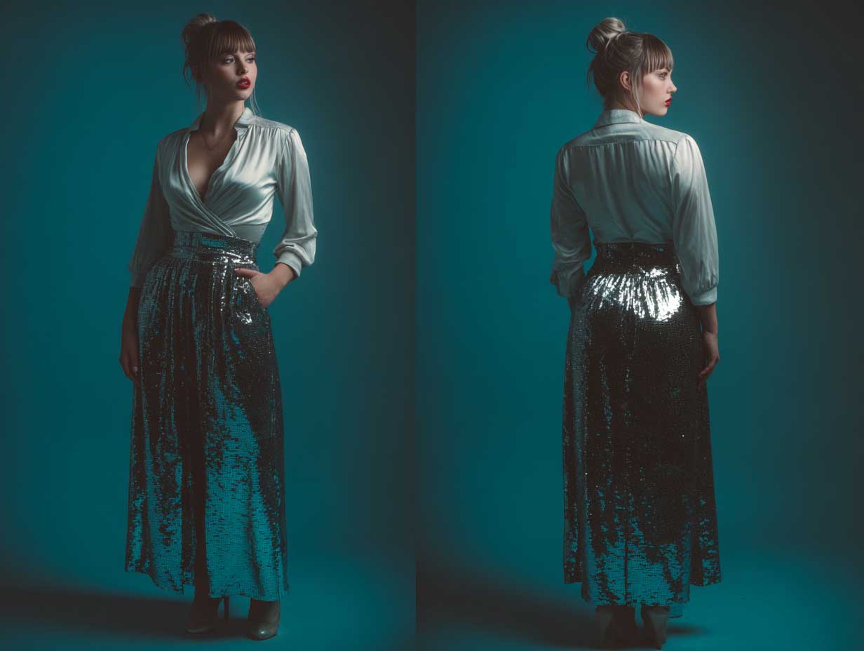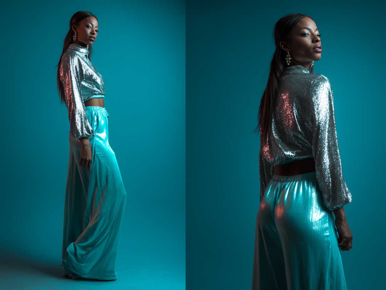 The pants—whether straight-legged or flared—are the hero piece. Their mirror-like finish reflects the surrounding lights, giving off disco-era energy with a modern twist. A fitted teal crop top grounds the look with color contrast and a flattering silhouette. The brightness of silver and the depth of teal work harmoniously, creating visual tension that turns heads.