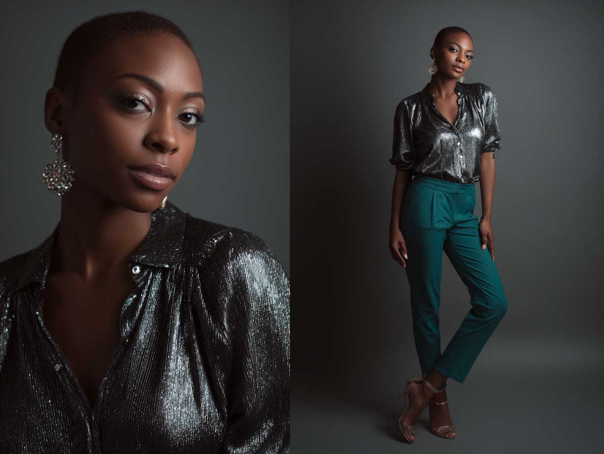 Accessories should enhance the shine—think silver hoop earrings or a geometric metallic clutch. A simple camisole or bandeau underneath the blazer keeps things minimal, letting the main pieces do the talking. Shoes can go strappy silver or even bold teal if you want to double down on the color story.