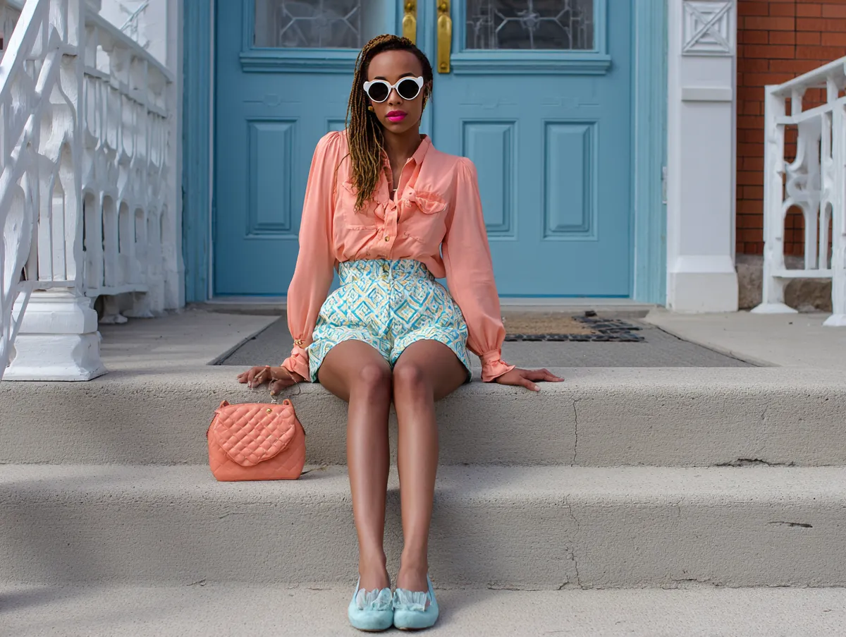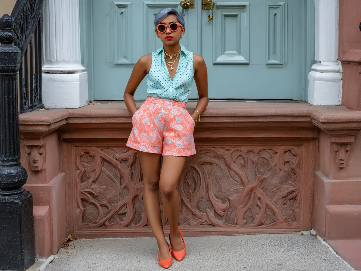 For those seeking playful skort outfit ideas, this coral and aqua printed combination offers a fresh and vibrant take on summer fashion. It’s a look that’s full of personality and perfect for those who love bold colors and fun prints.