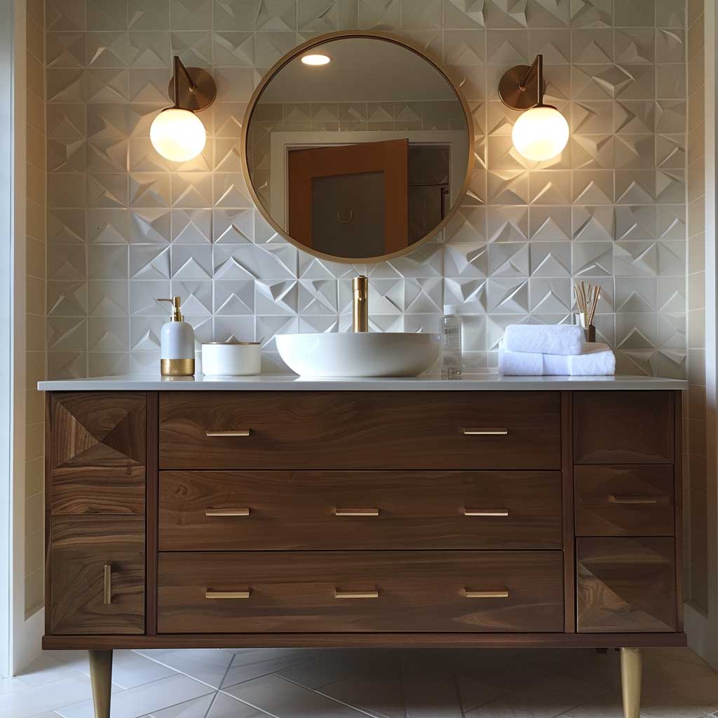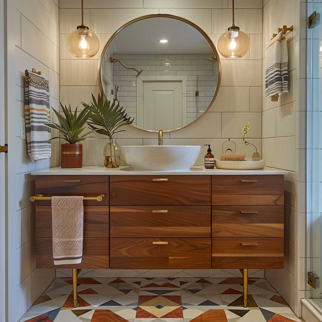 Complementing the vanity are retro geometric tiles that adorn the walls. These tiles feature bold patterns and earthy colors, reminiscent of the mid-century era. Their unique design adds visual interest and a nostalgic charm to the bathroom. The large round mirror above the vanity is another nod to mid-century modern aesthetics, offering both style and practicality. Its simple frame and generous size enhance the sense of space and light in the room.