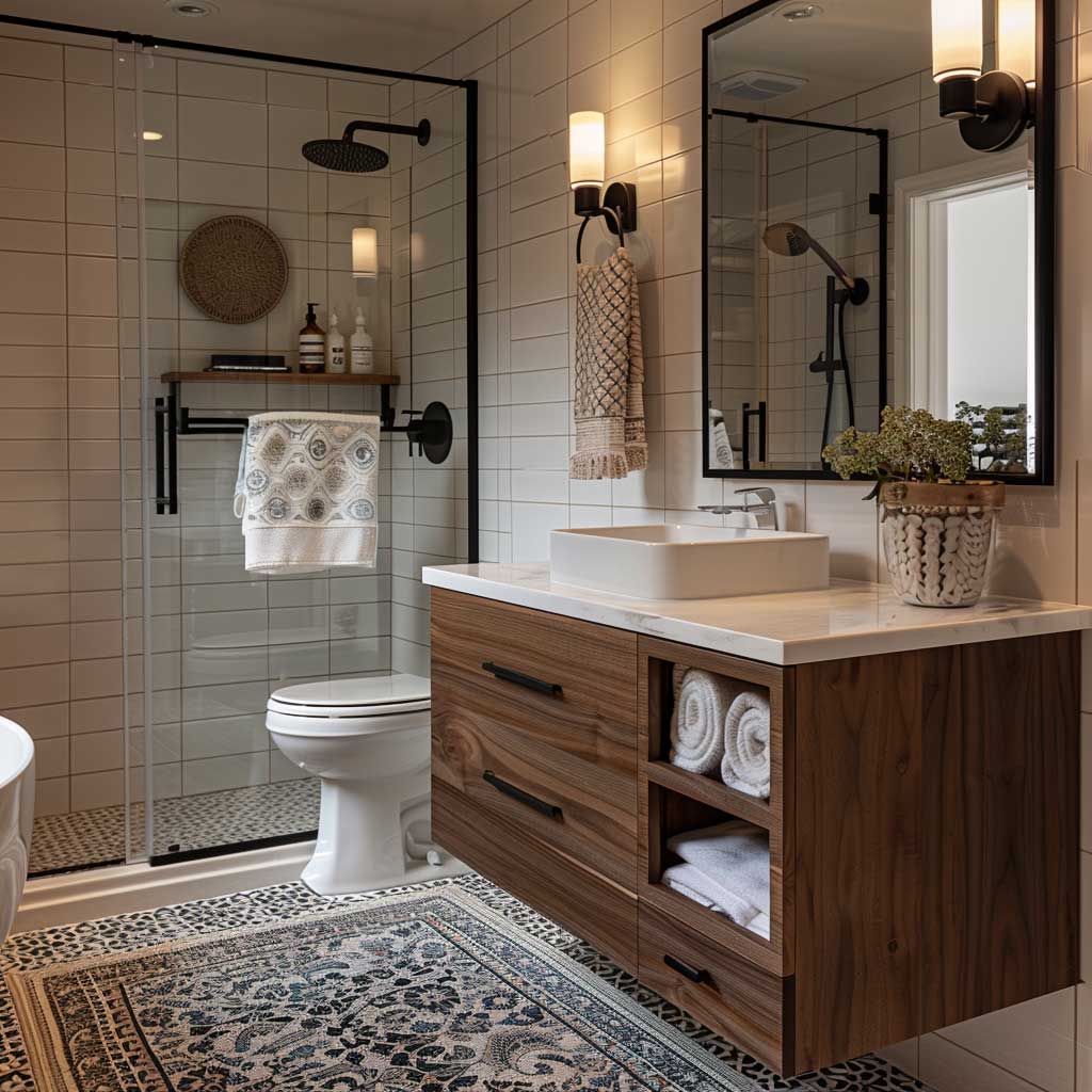 The floating walnut vanity is a highlight of this bathroom, showcasing the beauty and functionality of mid-century modern design. Walnut wood, with its rich, dark tones and smooth grain, adds a touch of luxury and warmth. The vanity’s floating design creates a sense of space and lightness, making the room feel larger and more open.
