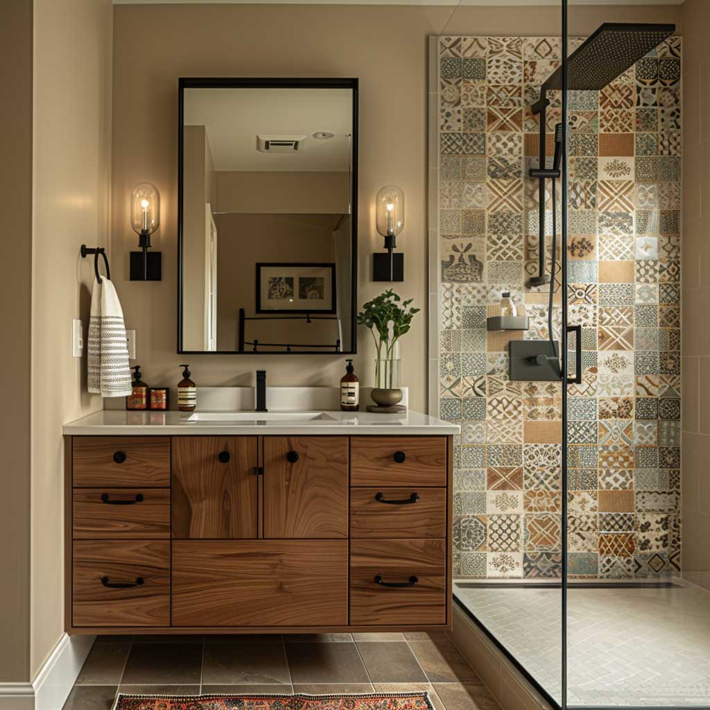 Vintage patterned tiles cover the floor and part of the walls, adding a touch of retro charm and visual interest. Their intricate designs and muted colors evoke the mid-century era, providing a striking contrast to the sleek walnut vanity. These tiles serve as a focal point, drawing the eye and adding depth to the overall design.