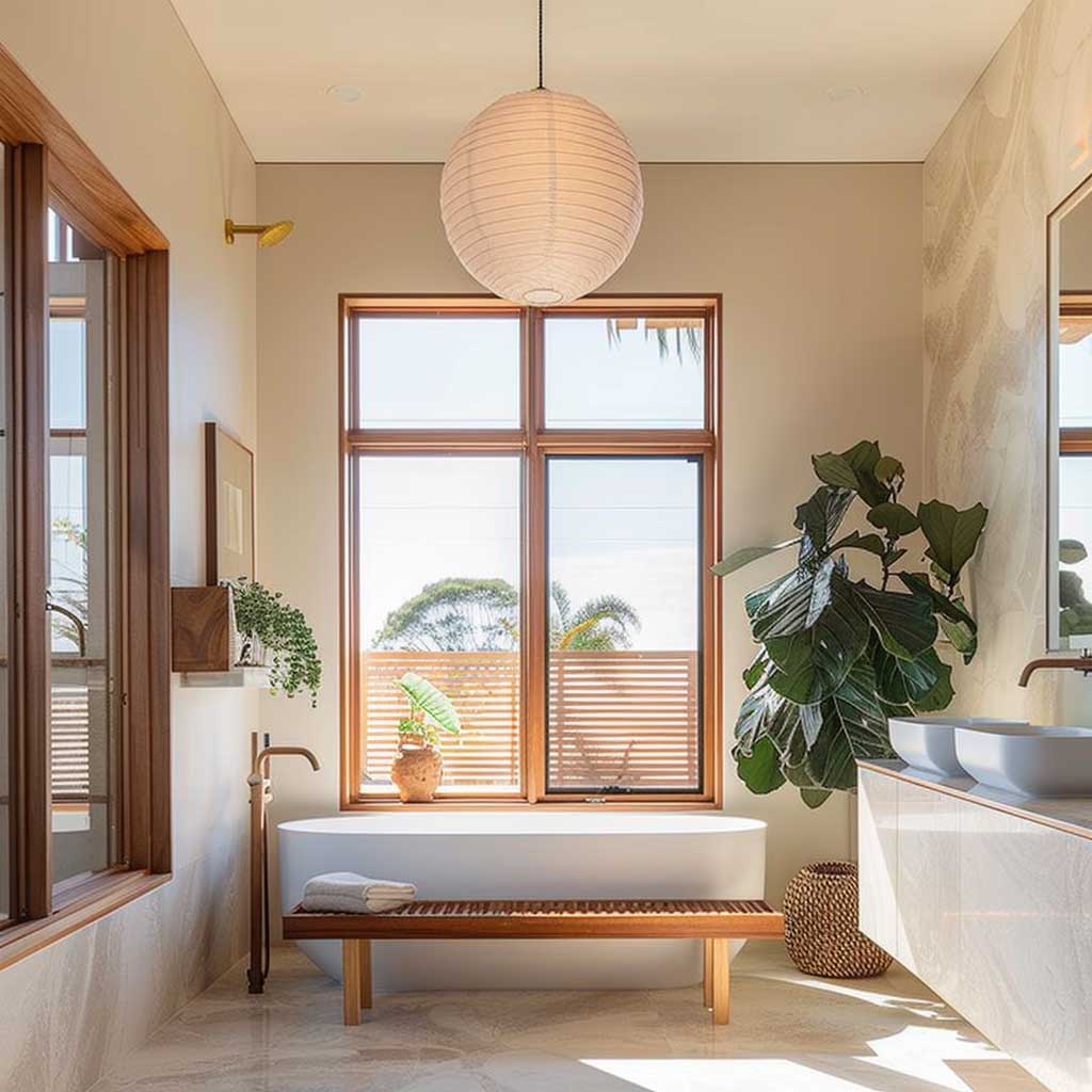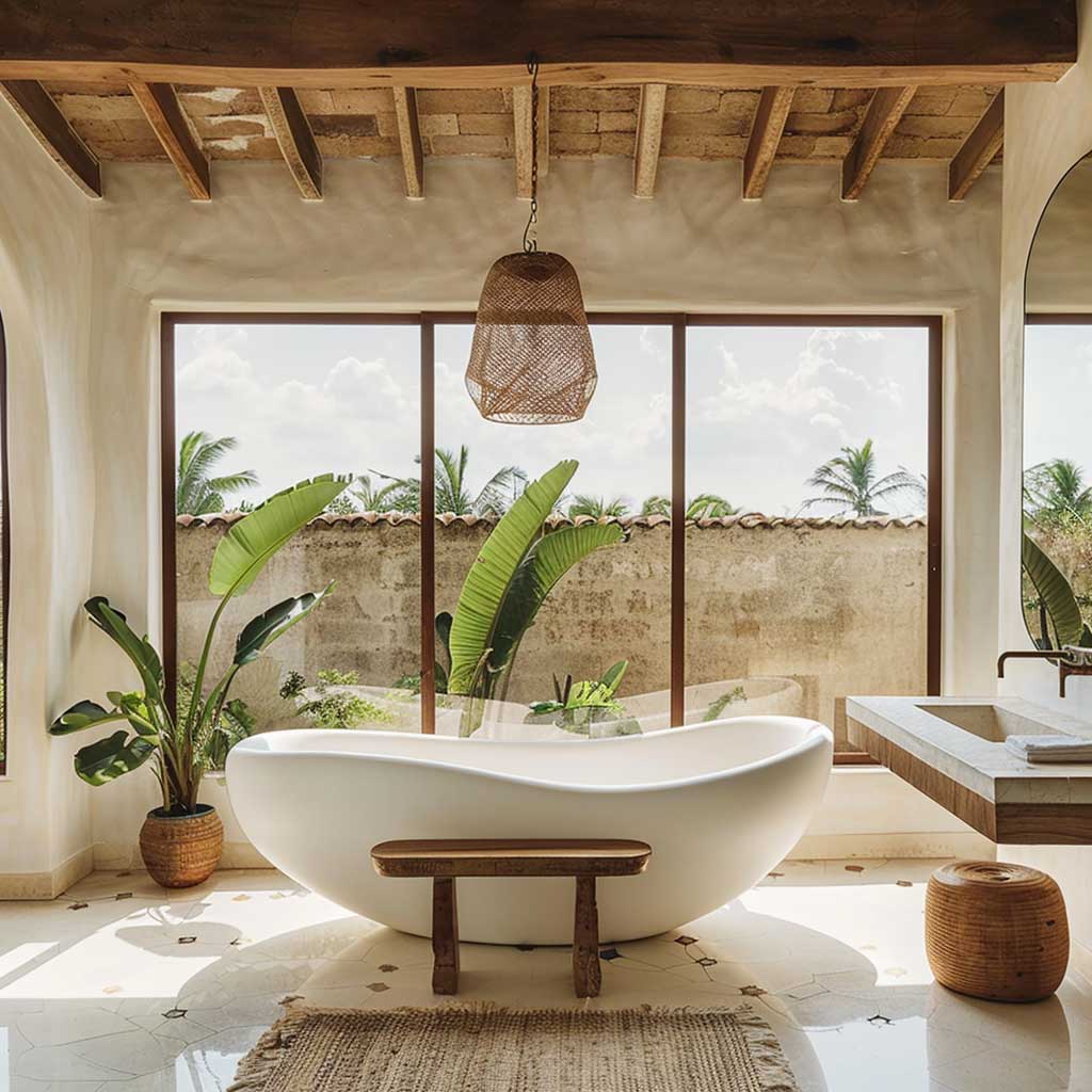 A teak wood bench adds both functionality and warmth to the room. Placed beside the tub, it provides a convenient spot for towels and bath essentials while introducing natural texture and color. The bench’s minimalist design complements the overall aesthetic, ensuring it blends seamlessly into the space.