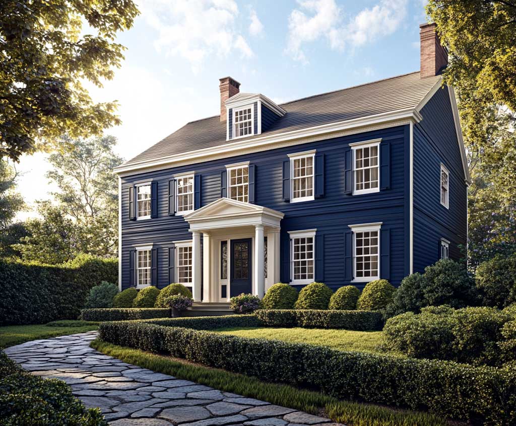 A navy blue and sand beige house color combination outside evokes a timeless elegance that never goes out of style. Navy blue provides depth and sophistication, while sand beige adds a light, earthy balance. Together, they create a contrast that’s bold yet harmonious.