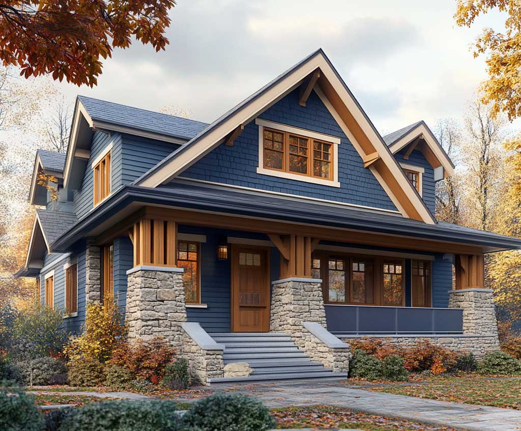 For a craftsman-style home, slate blue can serve as the primary color for the exterior walls. Warm beige accents can define the trim, porch pillars, and garage doors, creating a cohesive and harmonious appearance. Adding natural wood elements, such as a stained front door or exposed beams, enhances the warmth and texture of the design.