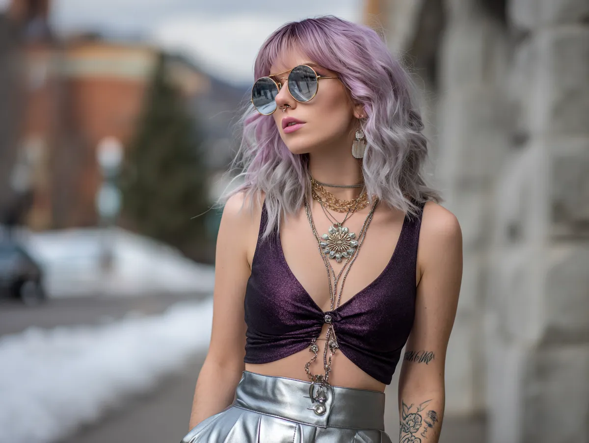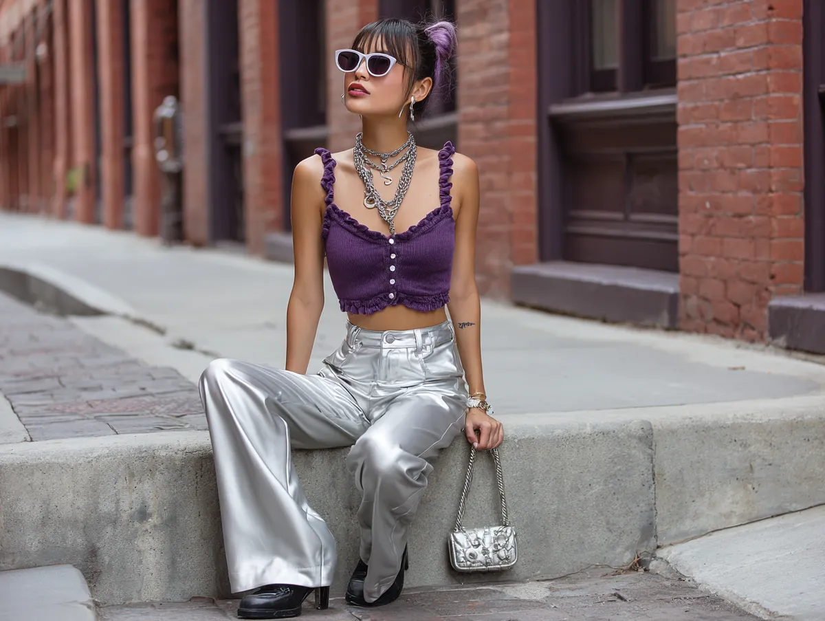 Combining a purple crop top with silver leather pants creates an eye-catching ensemble that balances edginess with modern emo flair. Purple brings emotional depth to the outfit, while silver adds a futuristic shine, blending two bold elements into one cohesive style. Emo outfit ideas thrive on such creative contrasts, where every piece plays a role in the final aesthetic.