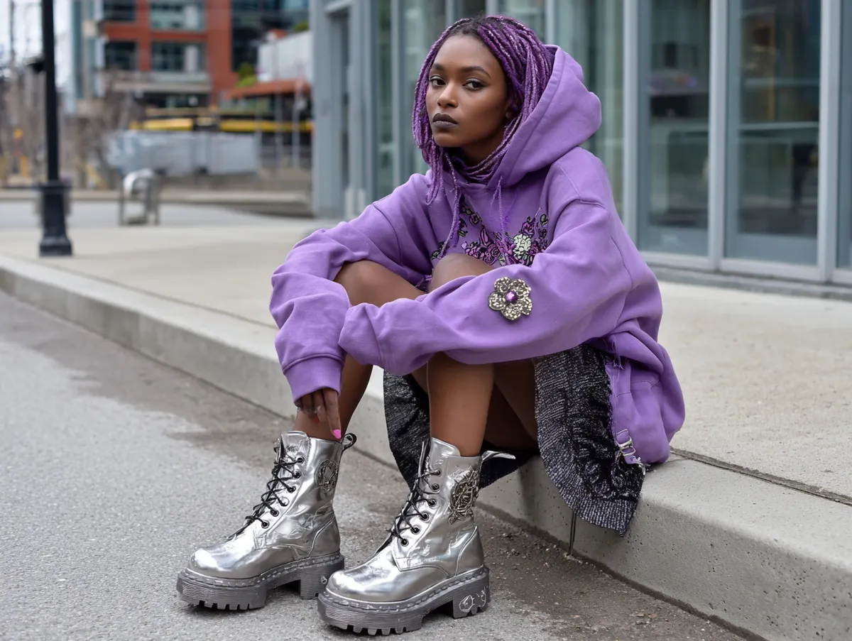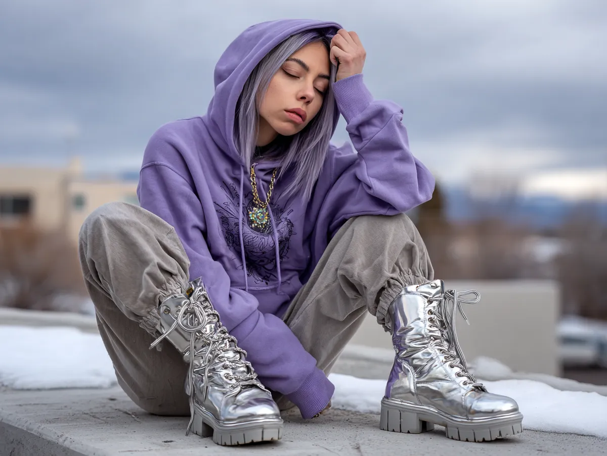 Layering is a hallmark of emo outfit ideas, and a layered purple hoodie paired with silver statement boots creates a bold yet cozy aesthetic. The oversized hoodie provides a relaxed silhouette, offering both style and comfort. Rich purple hues add a touch of drama to the outfit, serving as the focal point while leaving room for accessories to shine.