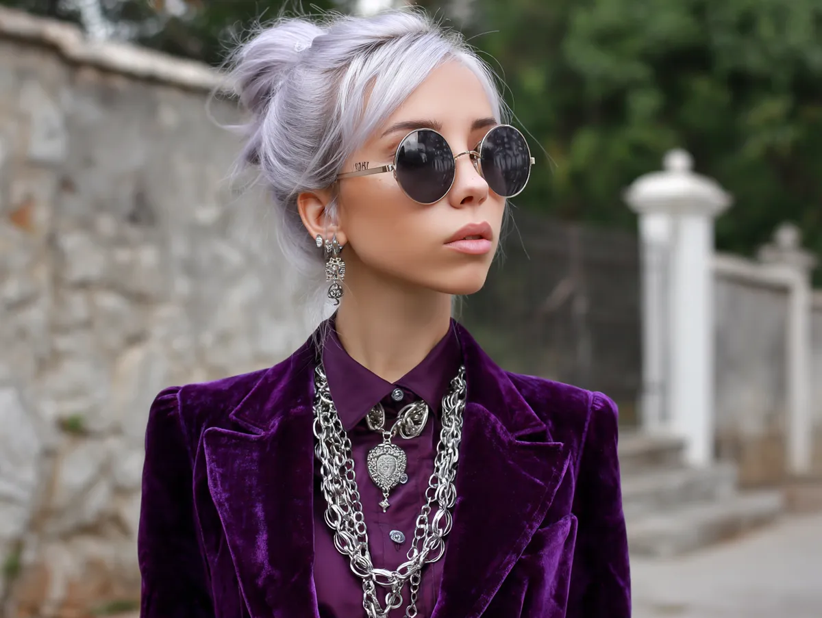 Makeup plays an essential role, with bold purple smoky eyeshadow taking center stage. Silver eyeliner accents on the inner corners of the eyes add an ethereal glow, while matte black lipstick introduces a moody vibe.