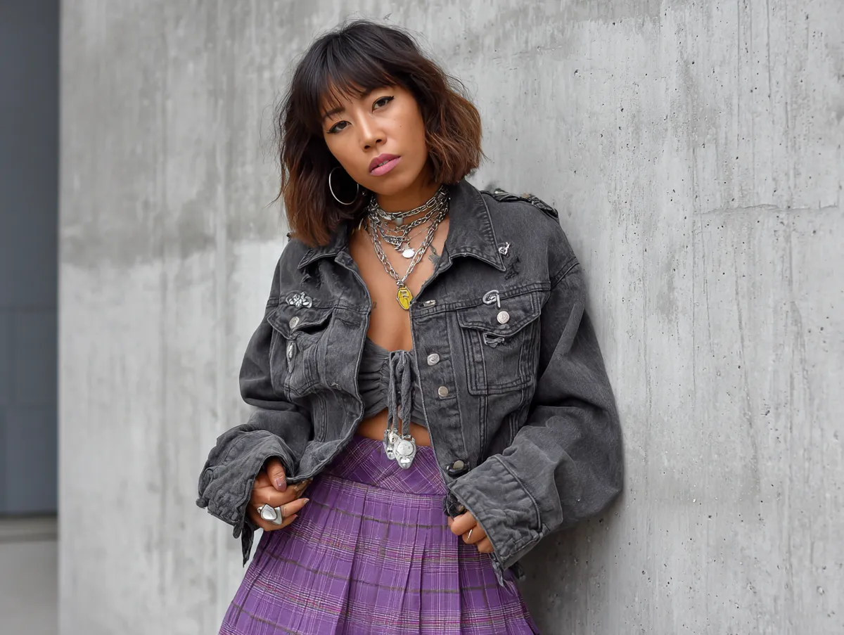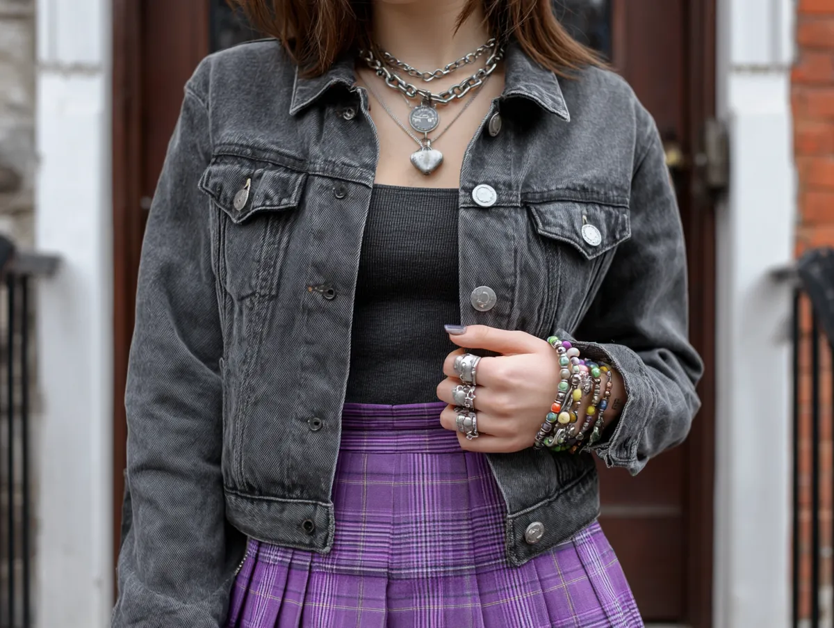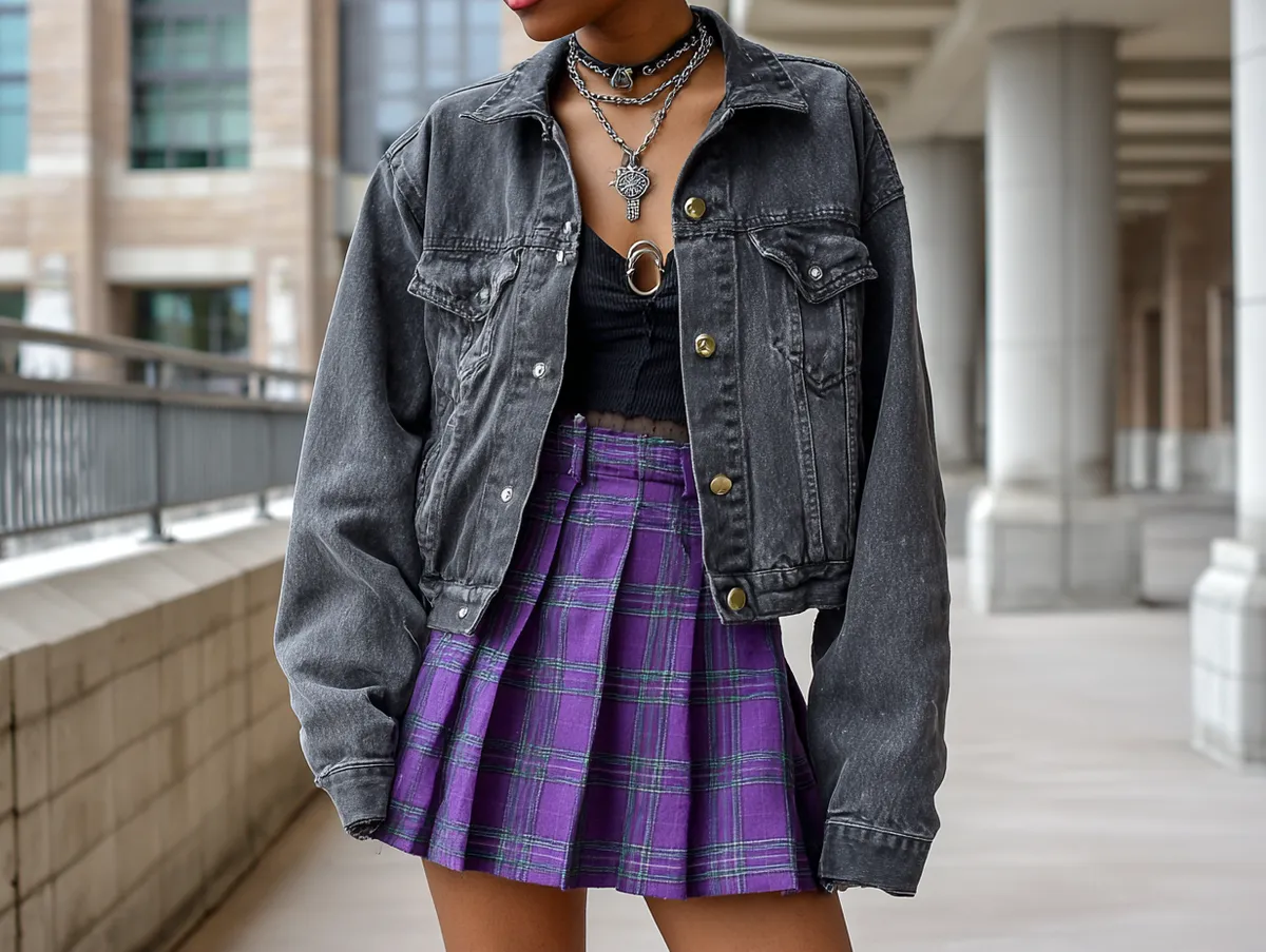 A charcoal denim jacket paired with a purple plaid skirt creates an edgy combination rooted in classic alternative fashion. The rugged texture of denim contrasts beautifully with the soft, vibrant patterns of plaid, creating a balance between structure and flow. This outfit is a versatile choice that transitions seamlessly from day to night.