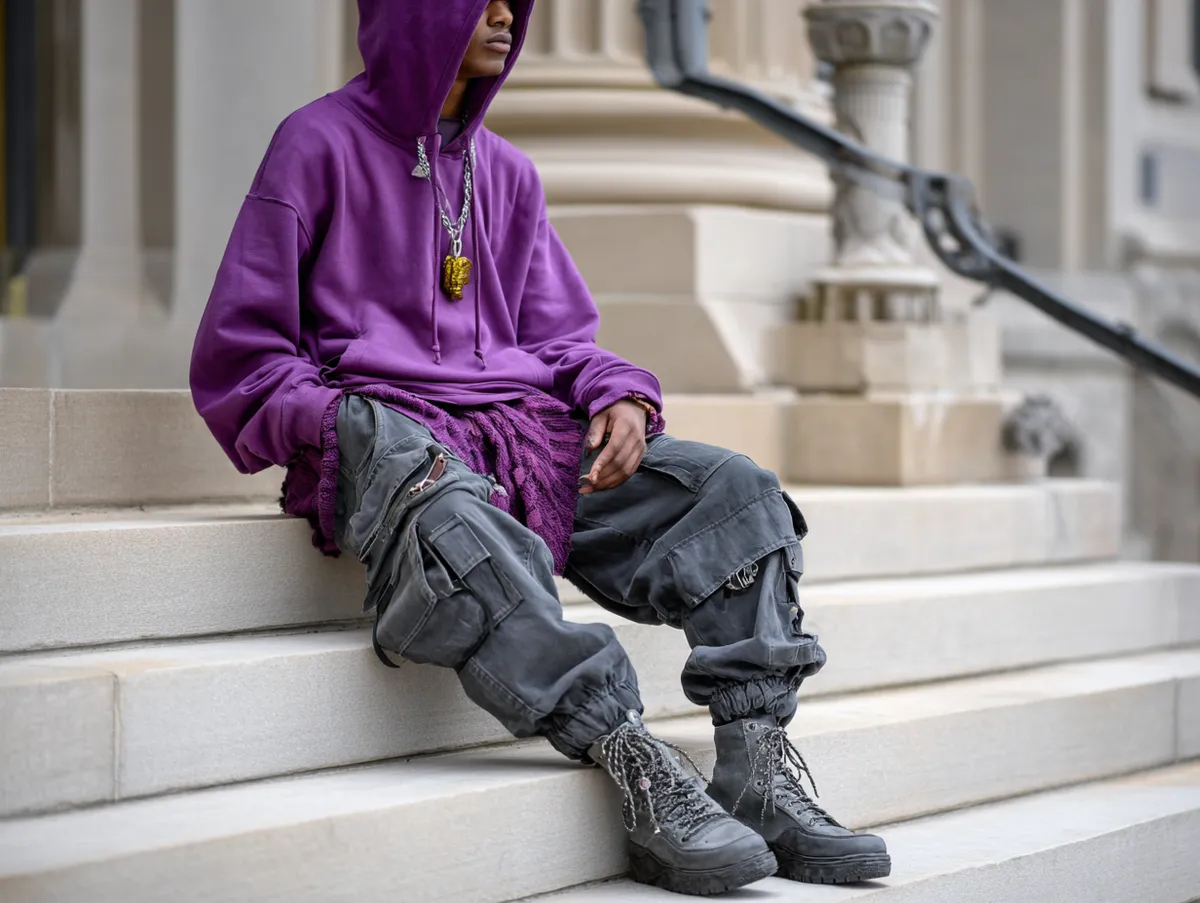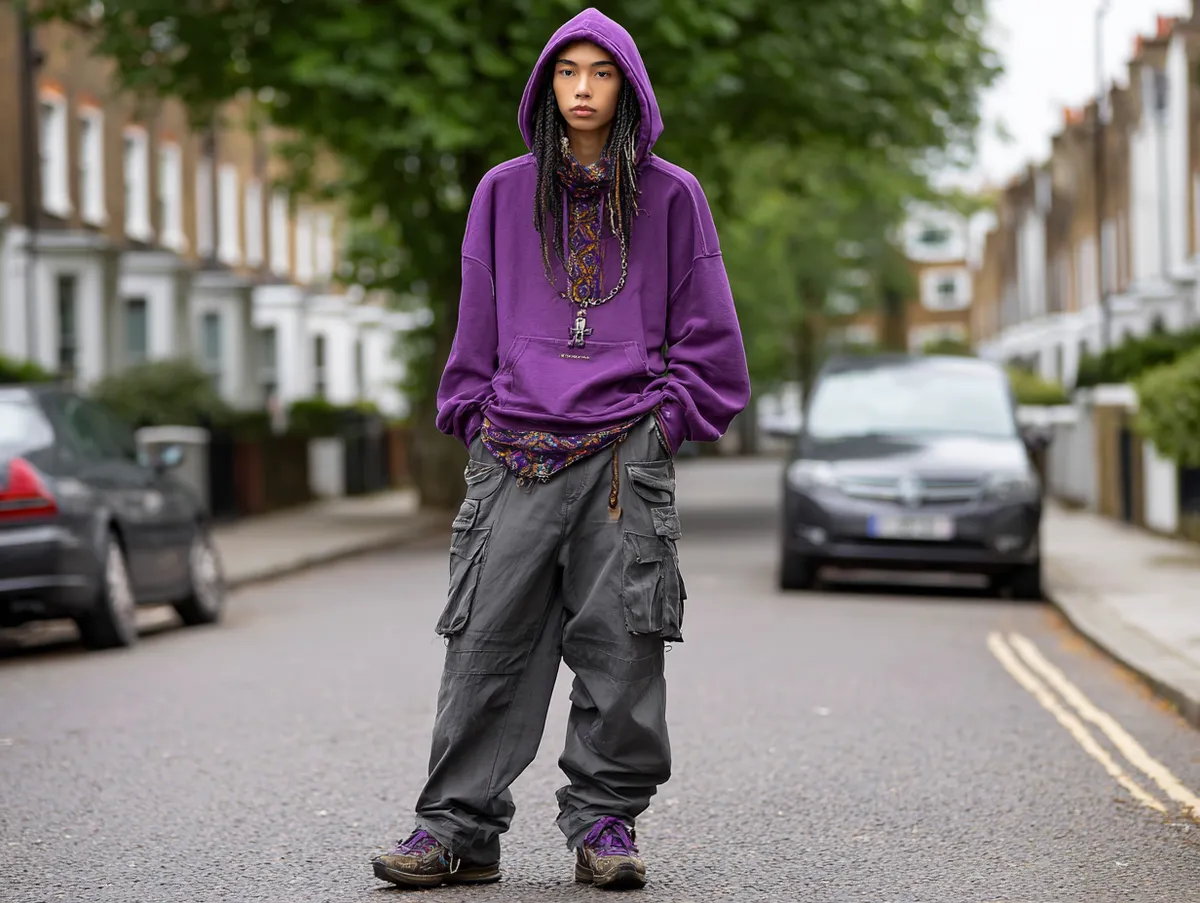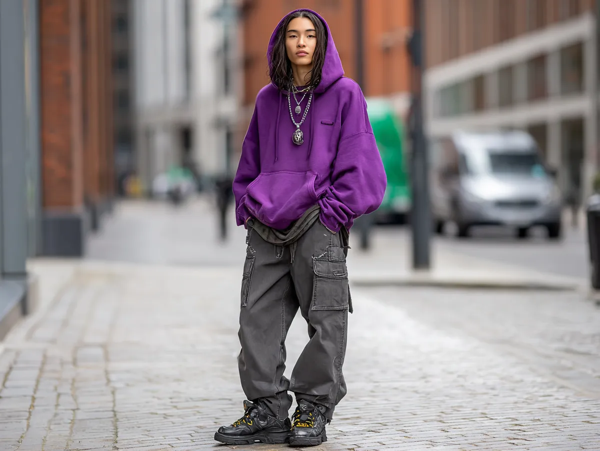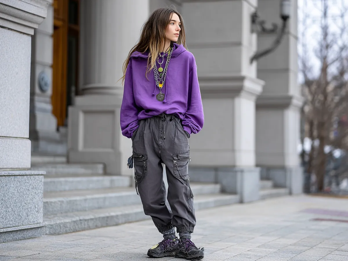Layering has always been an essential part of alternative fashion, and pairing a deep purple hoodie with charcoal cargo pants creates a look that’s both relaxed and rebellious. These two colors complement each other effortlessly, with the vibrant energy of purple balanced by the subdued tone of charcoal. This combination delivers an outfit that feels casual yet undeniably bold.