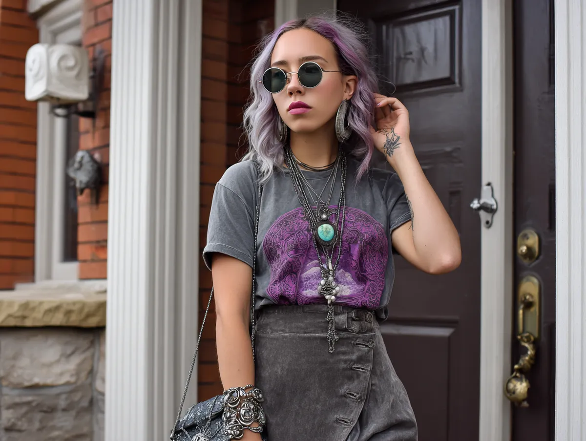 Graphic tees have always been a key part of alternative fashion, and when paired with charcoal accessories, they create a look that’s both expressive and effortlessly cool. A moody purple graphic tee serves as the centerpiece, adding personality through bold prints and washed-out hues.