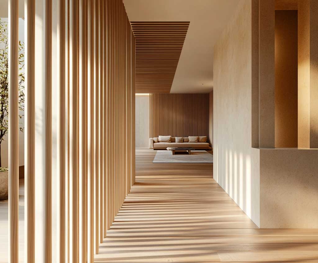 Bamboo slat partitions are a perfect solution for those seeking to introduce a natural yet modern aesthetic into their home. The vertical arrangement of bamboo slats allows for a clean, structured look that complements minimalist interiors. These partitions offer the advantage of defining spaces without completely closing them off, allowing light to filter through and maintain an open feel in the hallway.