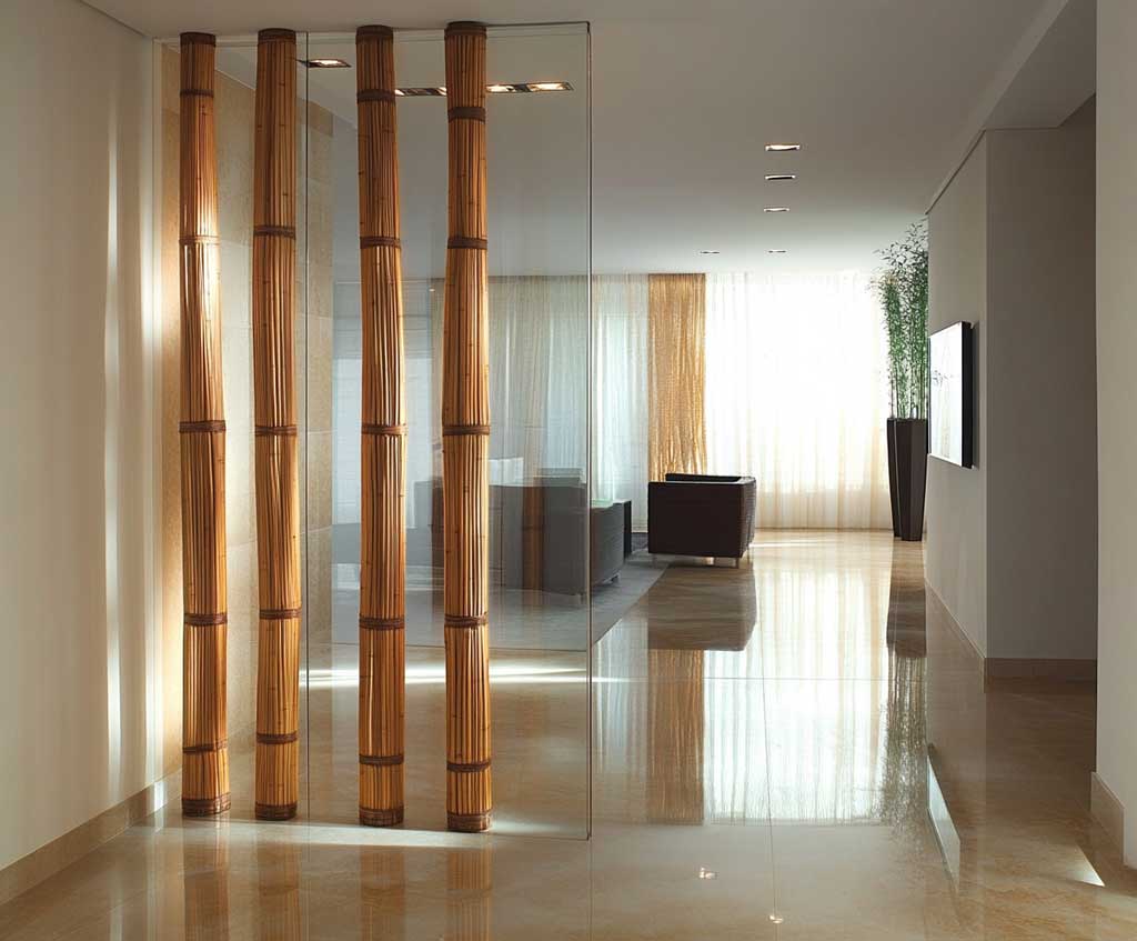 For a more modern and innovative take on hall partition ideas, combining bamboo with glass creates a striking and contemporary design. Bamboo poles arranged within sleek glass panels offer a unique way to divide spaces while maintaining a sense of openness and light. The natural beauty of bamboo is complemented by the transparency and reflective quality of the glass, making this type of partition perfect for those who want to mix organic materials with modern finishes.