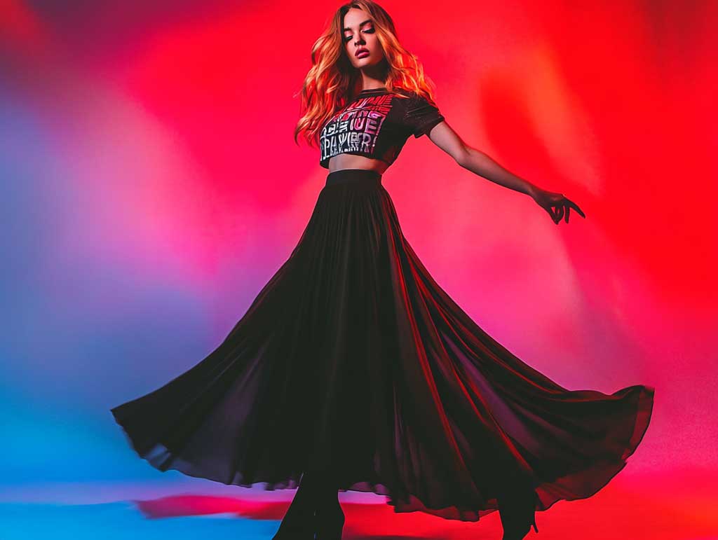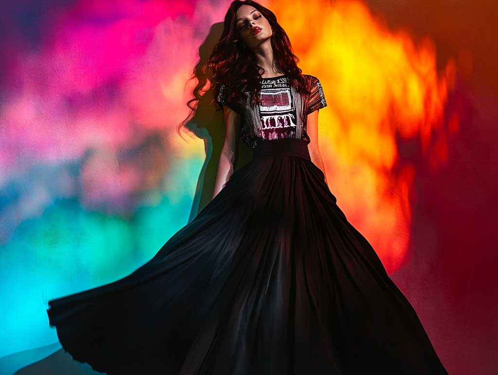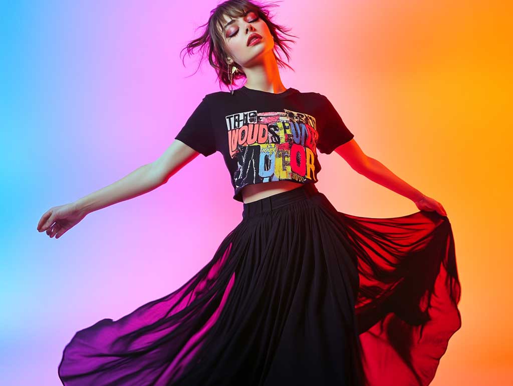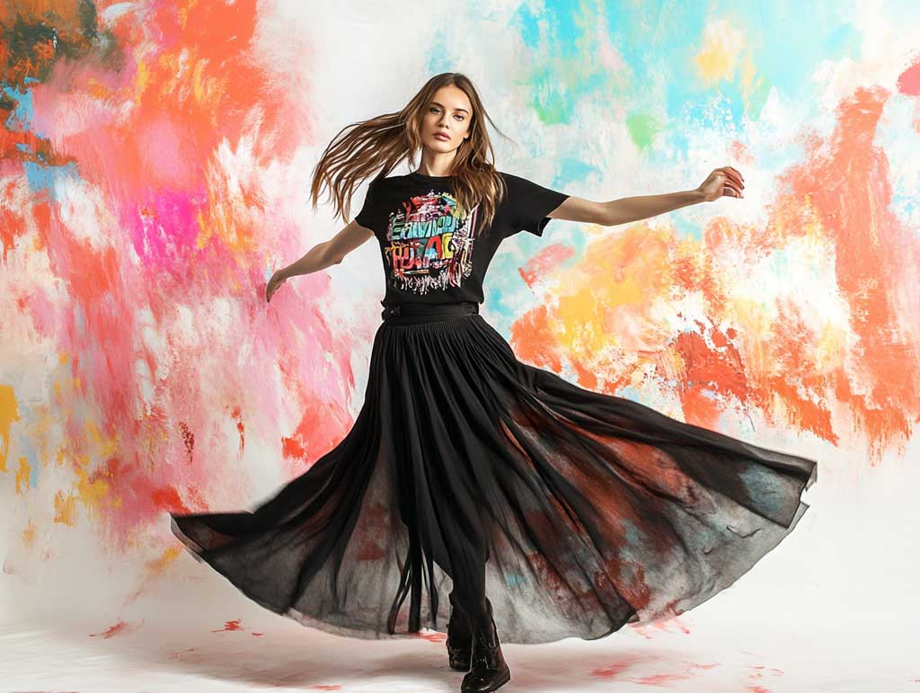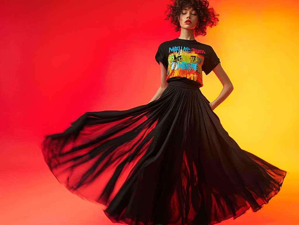 This style embraces the modern ethos of breaking traditional boundaries by combining classic elements with avant-garde designs. The long black skirt outfit ideas with creative graphic tees invite you to explore new dimensions of personal style. The juxtaposition of the solid, elegant black skirt against the striking and inventive designs of the graphic tee fosters a sense of balance and contrast that is both refreshing and powerful. The studio photo session, with its dynamic pose and colorful setting, perfectly encapsulates the creative spirit behind these choices.