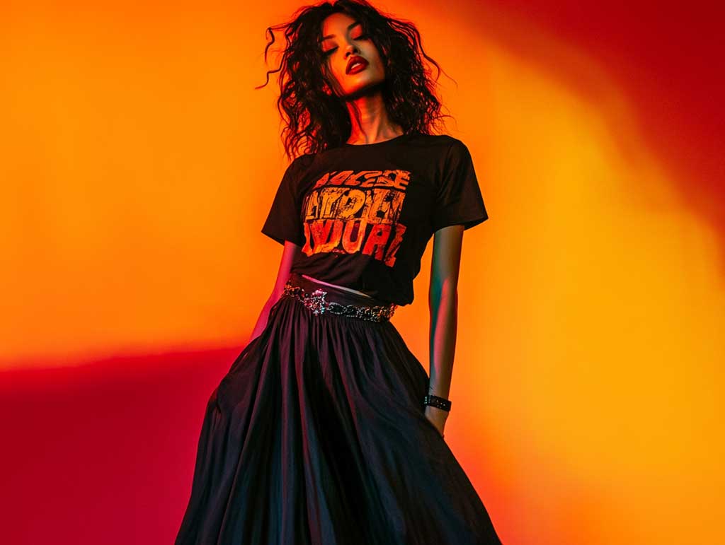 The urban graphic tee, with its contemporary prints and fresh design elements, provides an exciting contrast to the classic black skirt. This dynamic pairing draws attention to the intricacies of the design while maintaining a cool, laid-back vibe. In a studio session illuminated by gentle, diffused lighting, the subtle textures of the skirt are highlighted, and the vibrant graphics on the tee come to life with clarity and impact. Every detail is designed to create a narrative of effortless urban sophistication that resonates with modern trends.
