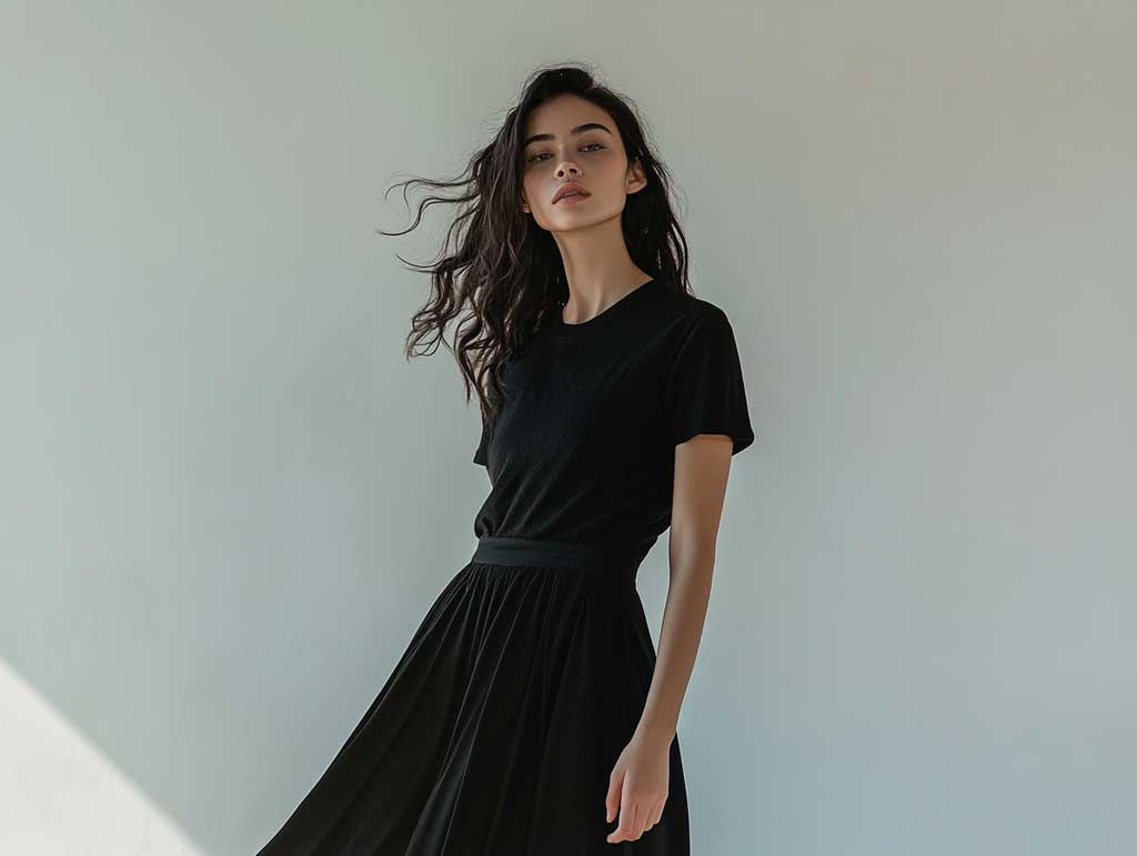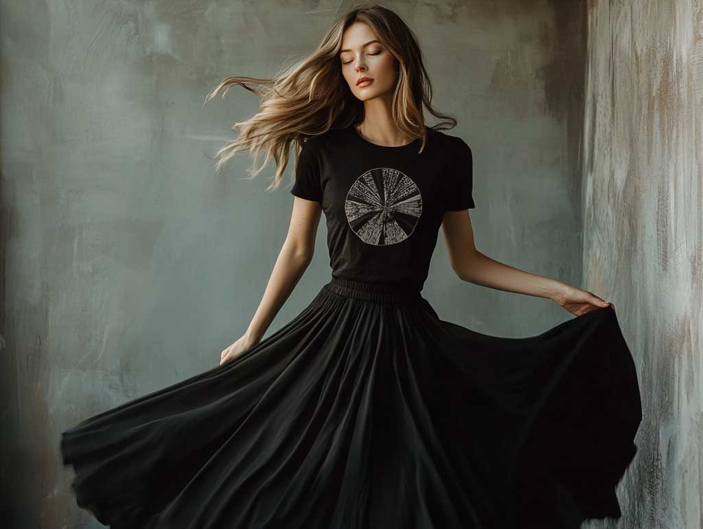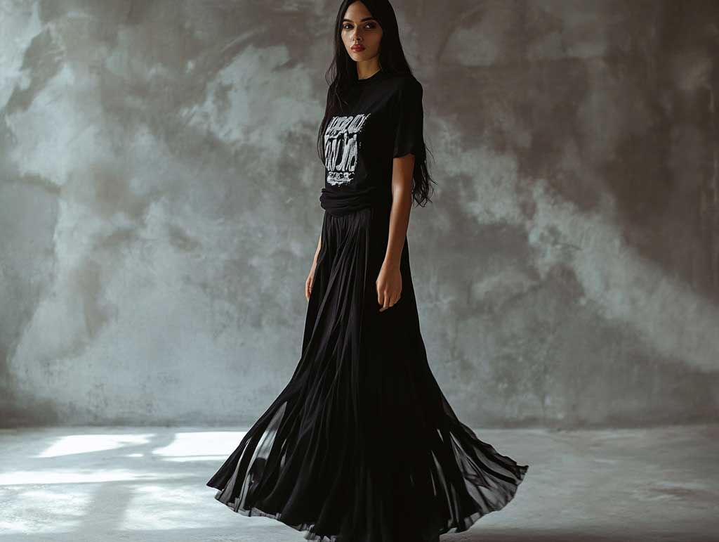 In a setting that exudes modern simplicity and urban elegance, exploring effortless long black skirt outfit ideas with urban graphic tees takes center stage. Picture a studio photo session where soft lighting and a minimalistic backdrop create an environment that celebrates the understated yet powerful nature of these outfit ideas. The long black skirt, with its fluid lines and versatile appeal, becomes the perfect partner for a graphic tee that channels urban energy with a creative twist. Together, they form a look that is relaxed yet meticulously styled, ideal for those who crave comfort without compromising on style.
