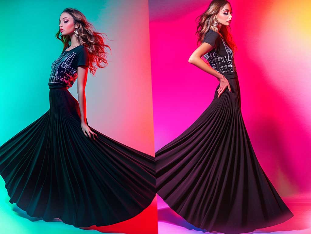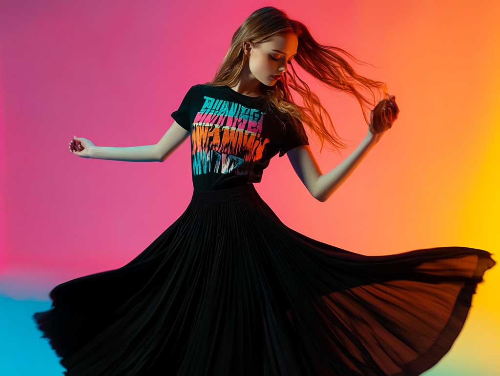 The creative graphic tee is more than just a casual top—it is a canvas of expression that brings life to the outfit through dynamic prints and innovative designs. When paired with the sleek lines of a long black skirt, the result is an outfit that balances modern minimalism with bold, imaginative details. In the studio environment depicted in the Midjourney prompt, every aspect of this look is celebrated. The artistic composition of the photograph captures the fluid movement of the skirt and the vibrant energy of the tee, creating an image that is both stylish and emotionally engaging.