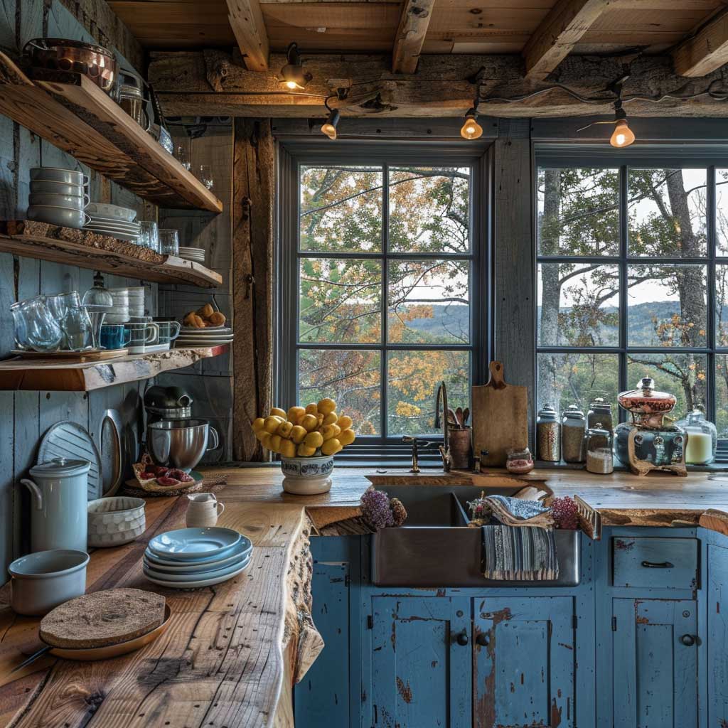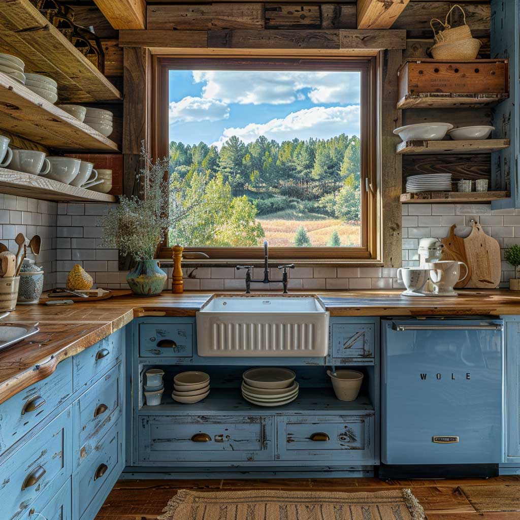 Add rustic touches with wooden stools, a farmhouse sink, and copper fixtures. These elements complement the blue tones and add to the overall cozy feel of the space. Soft blue curtains or blinds can frame the window, allowing light to filter in gently while adding to the serene ambiance.