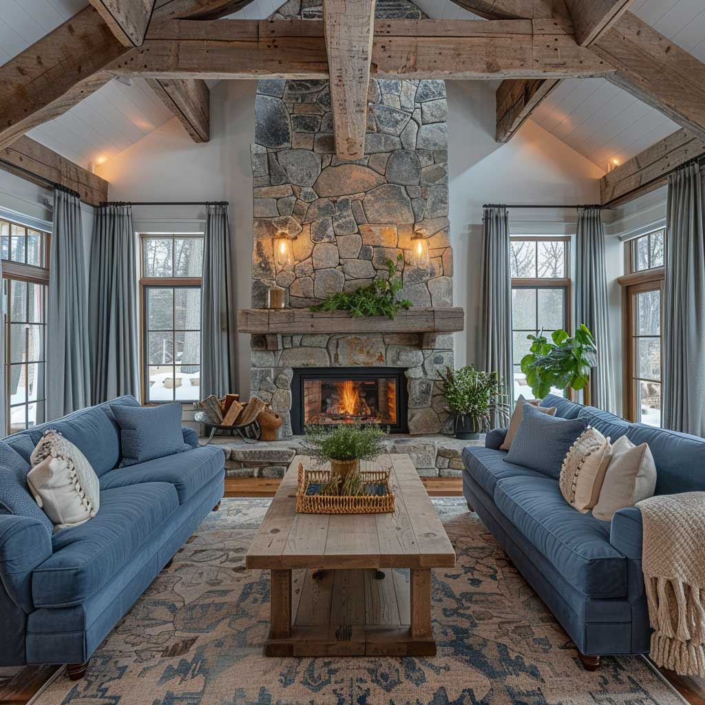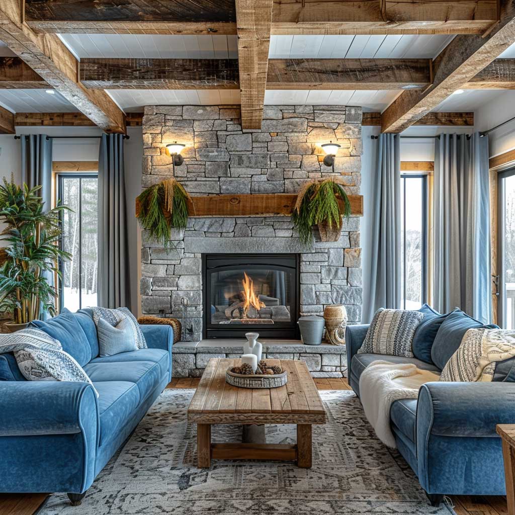 Rustic touches, such as exposed wooden beams and a stone fireplace, add warmth and character to the space. The combination of these natural elements with the cool blue tones creates a perfect balance, making the room feel both cozy and expansive. Indoor plants add a fresh, vibrant touch, harmonizing with the blue and bringing a bit of the outside in.