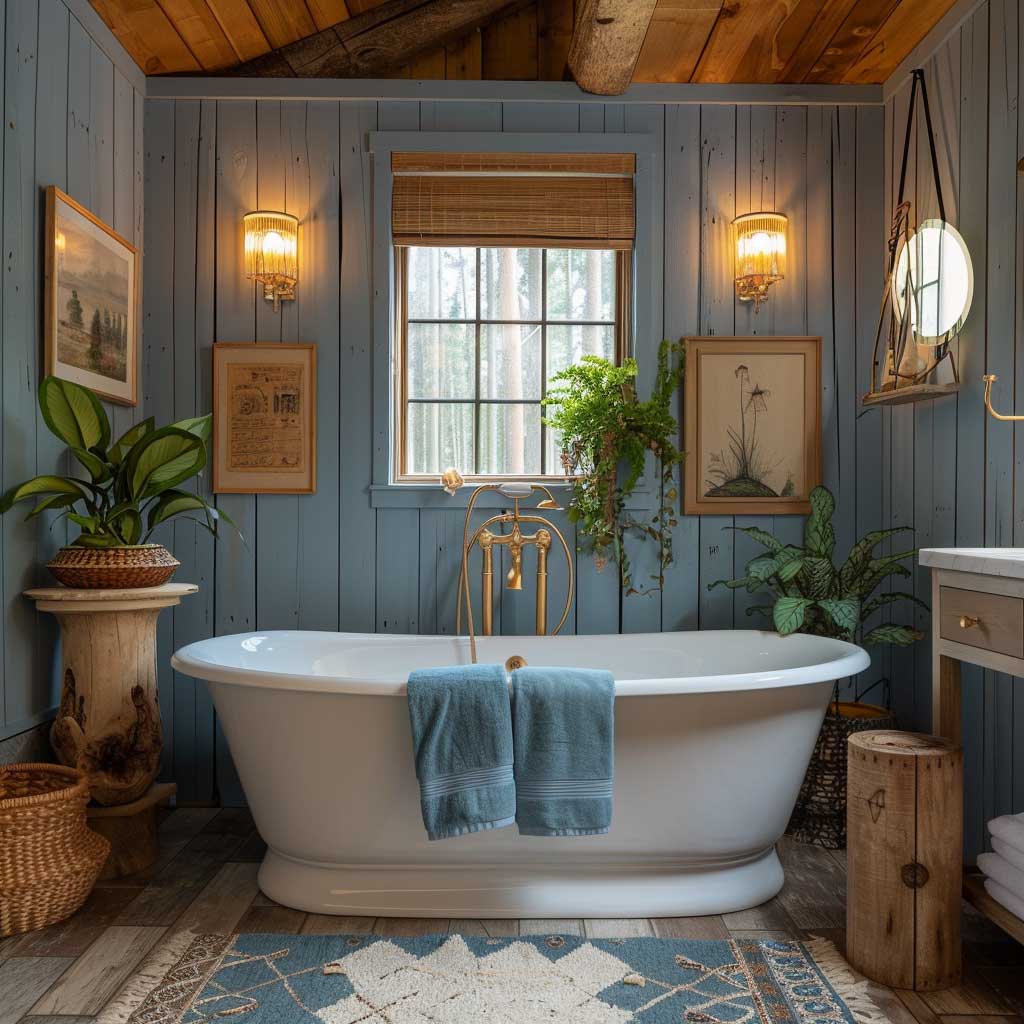 A freestanding tub is a luxurious focal point, and its simple elegance complements the soothing blue tones. Surround the tub with rustic wooden accents, such as a wooden bath caddy or shelves, to add warmth and texture. These natural elements contrast beautifully with the cool blue hues, creating a balanced and inviting space.