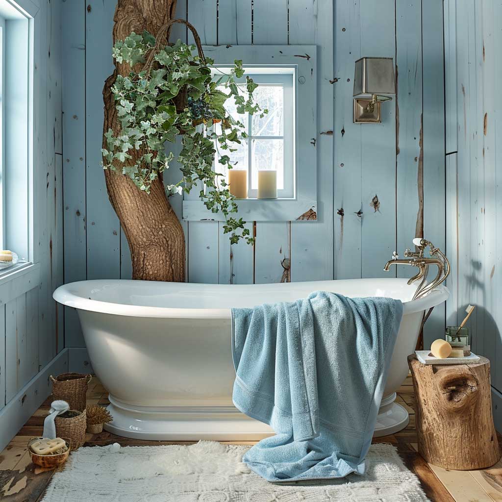 Personal touches, such as blue glass bottles or handmade soap dishes, can add character and make the space feel uniquely yours. The combination of light blue walls, rustic wooden accents, and spa-like elements creates a bathroom that is both calming and inviting, perfect for unwinding after a long day.