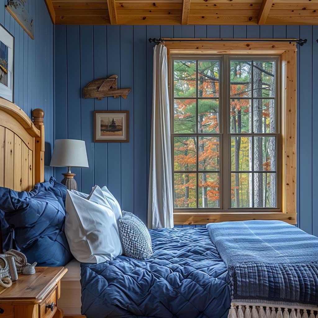 Navy blue bedding adds depth and richness to the room. Choose plush, comfortable materials that invite relaxation. Complement the bedding with white nautical accents, such as striped pillows, a rope-framed mirror, or a model ship on a shelf. These elements bring a touch of the sea, enhancing the calming vibe of the blue hues.