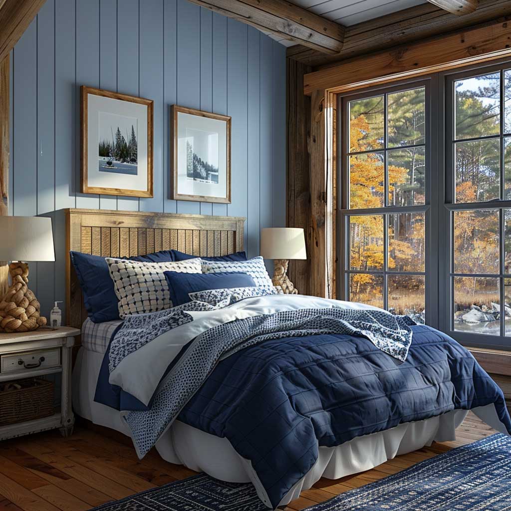 Decorate with personal touches, such as framed photos or artwork in blue tones, to make the space feel uniquely yours. The combination of light and navy blues, nautical accents, and rustic wooden elements creates a bedroom that is both serene and inviting, perfect for restful nights and peaceful mornings.