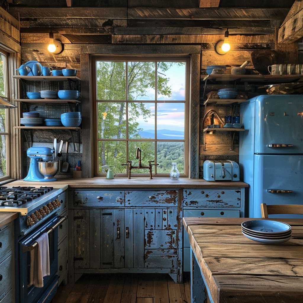 The kitchen is a central hub in any home, and incorporating blue tones can make it a calm and inviting space. Start with blue cabinets that provide a bold yet soothing statement. The cool blue color adds a modern touch while maintaining the rustic charm of the cabin.