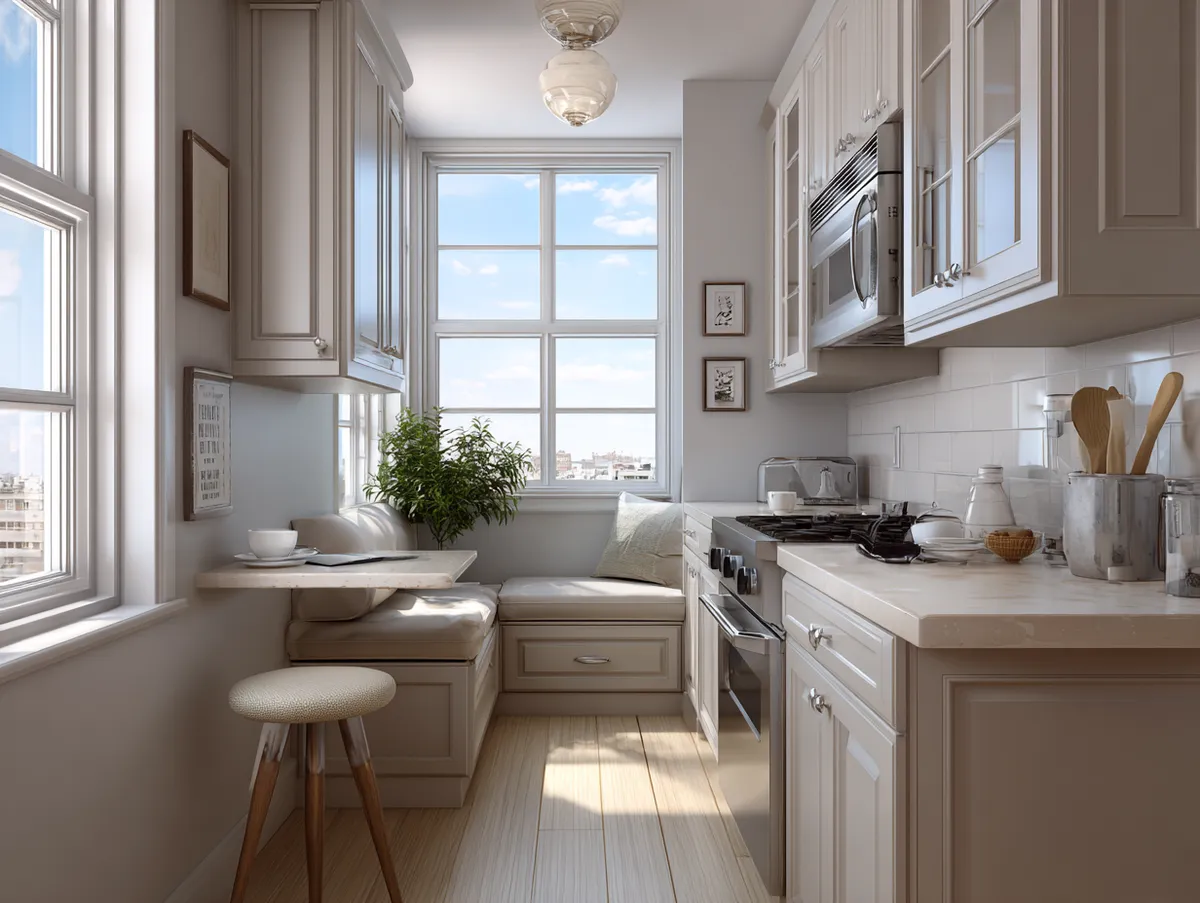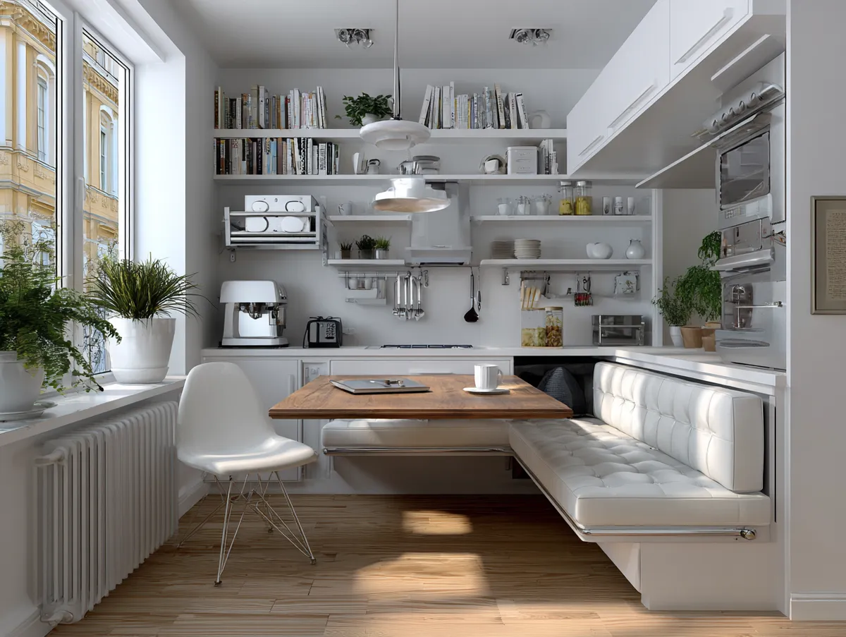 One of the standout features in this image is a fold-away dining table attached to a cabinet. When not in use, the table neatly folds back into the cabinet, freeing up floor space. This multi-functional piece of furniture exemplifies the innovative solutions necessary in a small kitchen and shows that style does not have to be sacrificed for practicality.