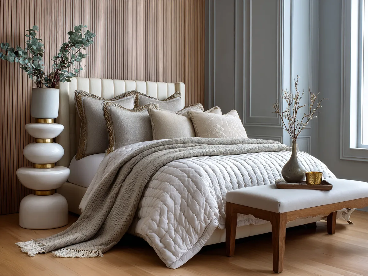 In this bedroom setting, the fluted panel serves as a feature wall, immediately catching the eye with its wave-like ridges and inviting texture. The fluted panel design adds an architectural depth to the room, creating a visually appealing backdrop for the bed. It imbues the room with a warm, inviting feel, perfect for encouraging relaxation and restful sleep.