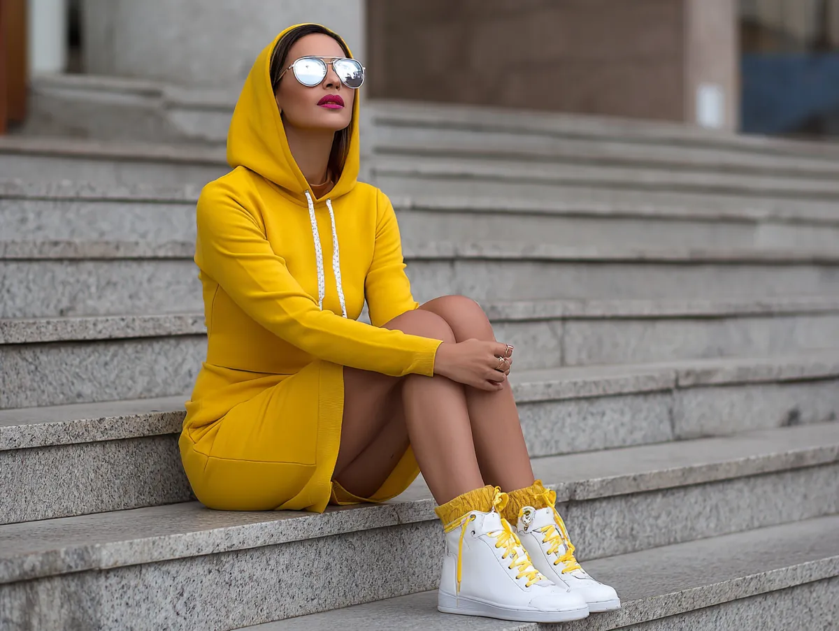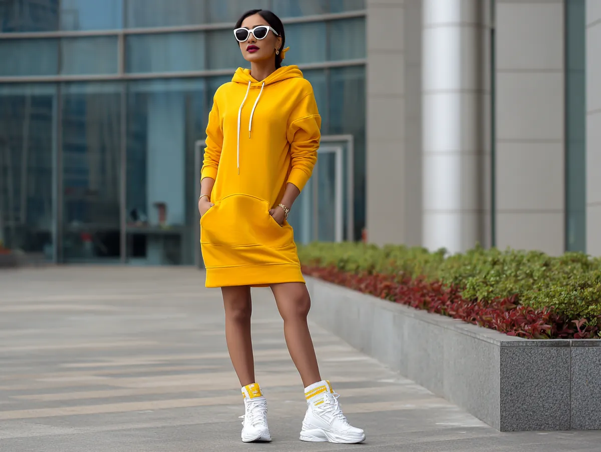For a sporty and casual look, a yellow hoodie dress paired with white athletic sneakers is a fun and comfortable option. The bright yellow color adds a playful touch to the overall sporty vibe, making this combination perfect for those who enjoy staying active while keeping their fashion game on point. Dress and sneakers outfit ideas like this one are ideal for casual weekends, outdoor activities, or simply running errands.