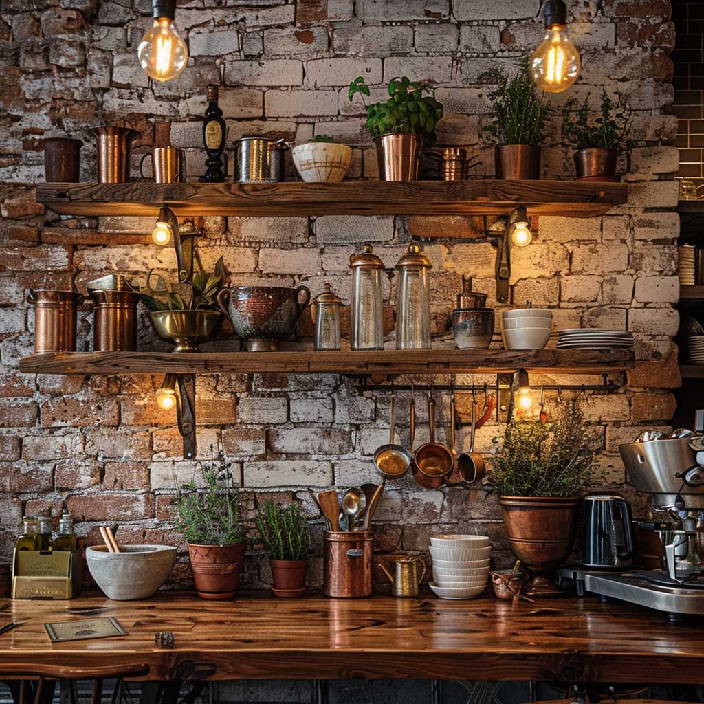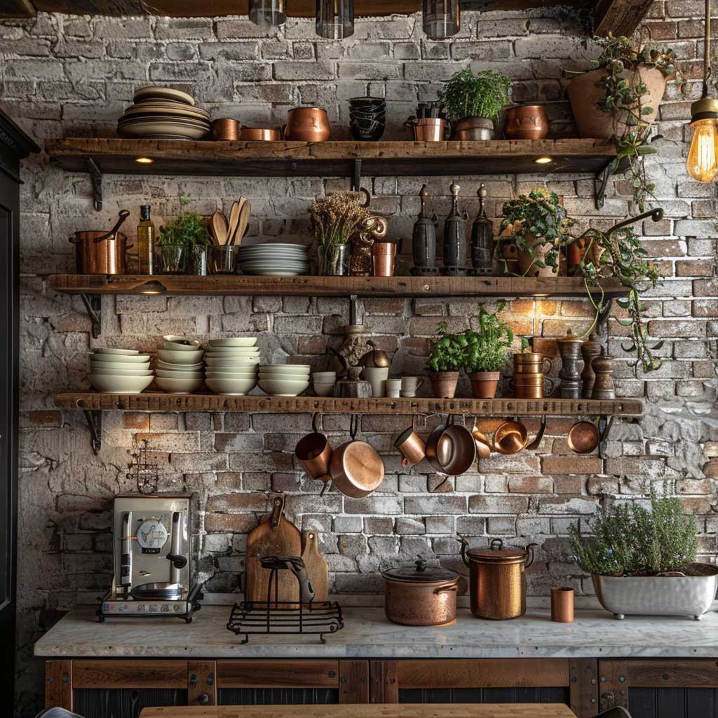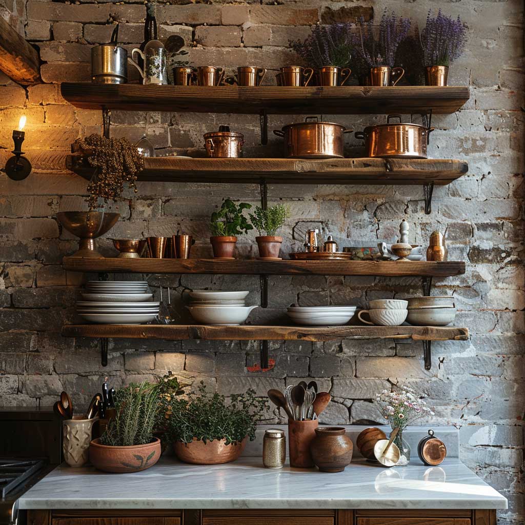 Rustic floating kitchen shelves are not many features in the kitchen that would add warmth and character to an interior design. They are the best storage solution and pieces bringing charm and nostalgia to any kitchen. What is more, they create a cozy atmosphere. Using weathered wood in making shelves, where each plank tells a story of its past life, and mounting them against a rugged brick wall—totally unexpected in the design of a kitchen—might bring that bit of quirkiness to its interior.