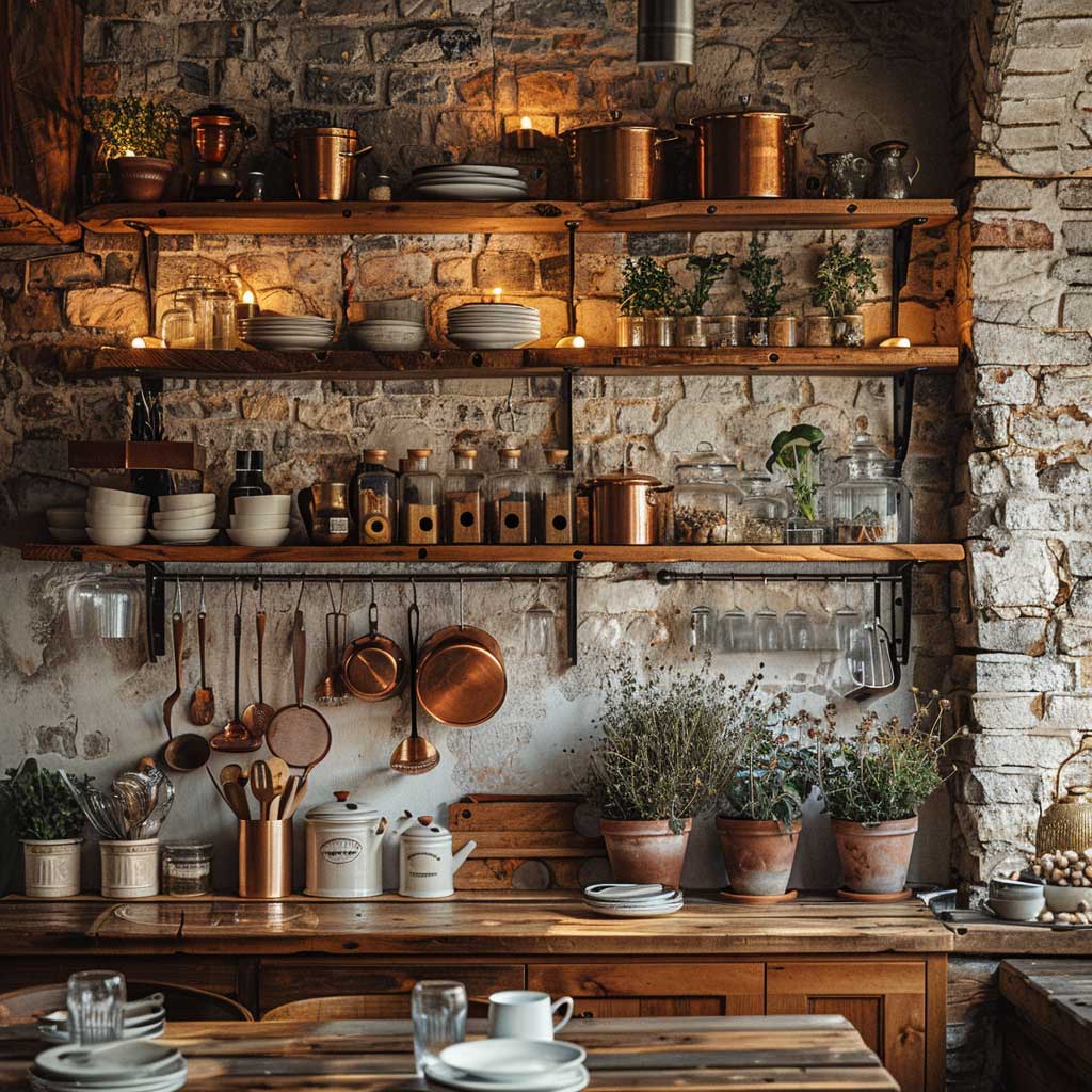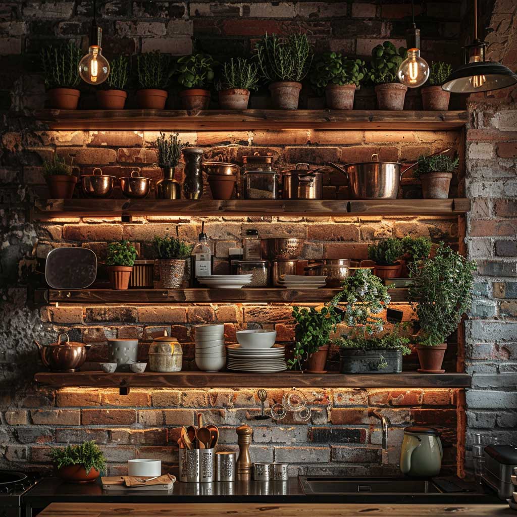 These shelves can be decorated with items that show the charm of a traditional kitchen to increase the rustic feeling. Antique copper pots, hand-painted ceramic dishes, and classic glass jars full of pantries like pasta and beans are both decorative and useful. Little potted herbs will bring a green splash to the setting and fill the air with fresh smells to make the kitchen look alive and inviting. The warm soft illumination of the shelves deepens the mood, casting subtle shadows and a gleam that makes the kitchen a favorite gathering place in the home. This has been designed such that the kitchen is always a comforting and warm place, where every nook is welcoming and familiar.